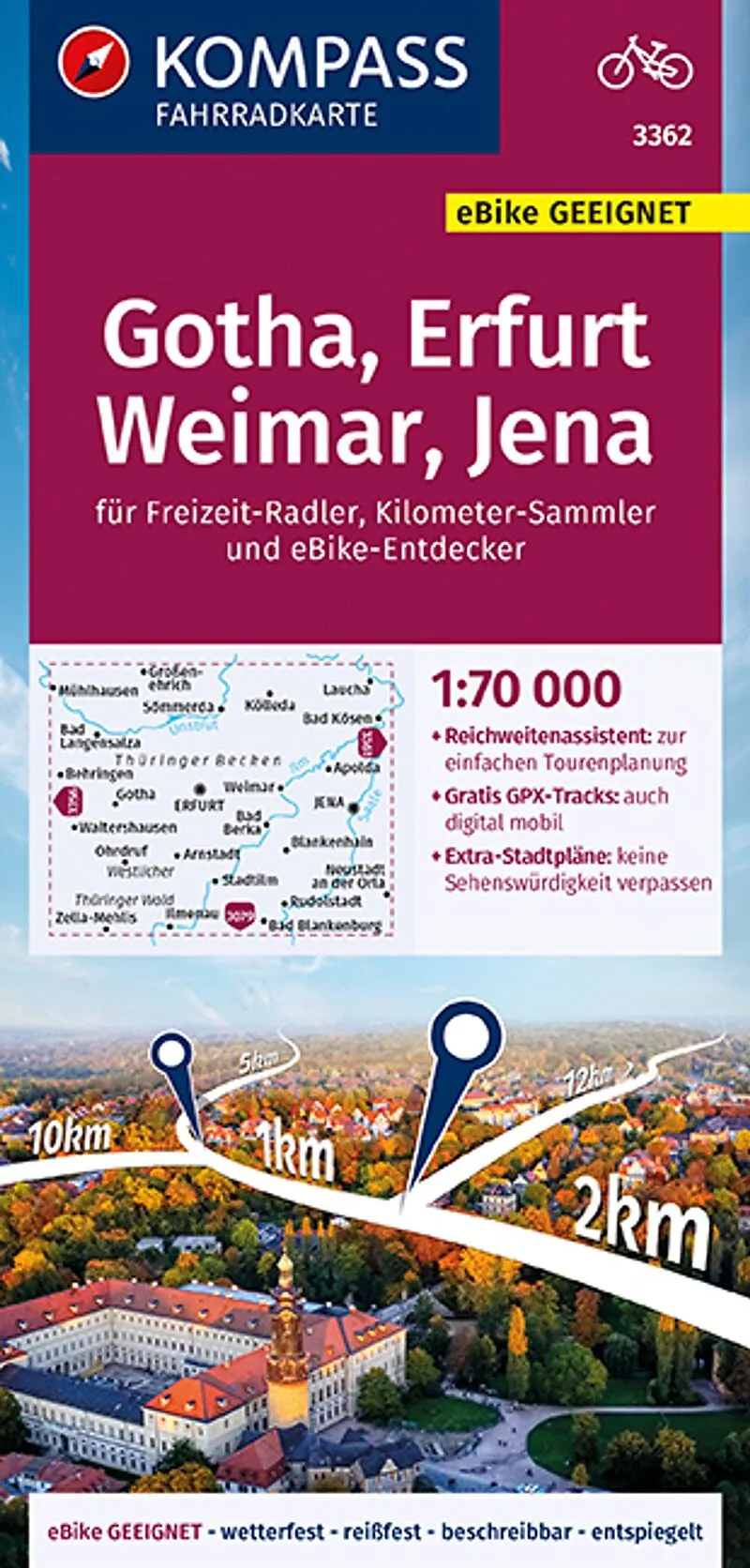 Die Fahrradkarte Gotha, Erfurt, Weimar, Jena von Kompass im Maßstab 1:70.000 bietet einen guten Mix aus Detailgrad und Abdeckung der Region. Sie beinhaltet alles, was man für eine gute Planung und Orientierung einer Fahrradtour benötigt. Das reiß- und wetterf...