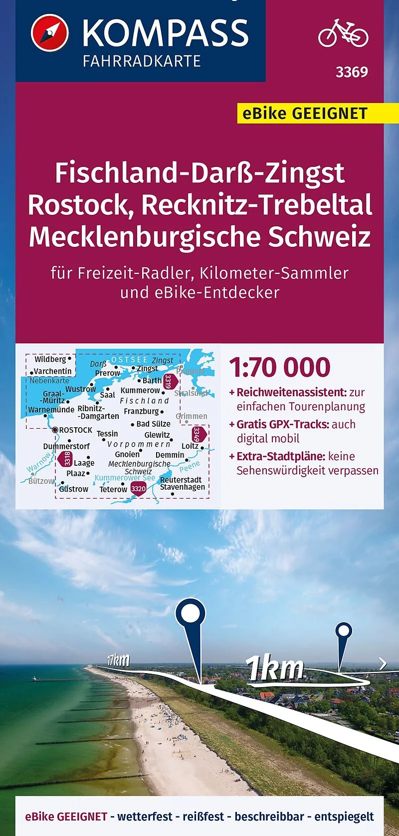 Die Fahrradkarte Fischland-Darß-Zingst, Rostock, Recknitz-Trebeltal, Mecklenburgische Schweiz von Kompass im Maßstab 1:70.000 bietet einen guten Mix aus Detailgrad und Abdeckung der Region. Sie beinhaltet alles, was man für eine gute Planung und Orientierung ...