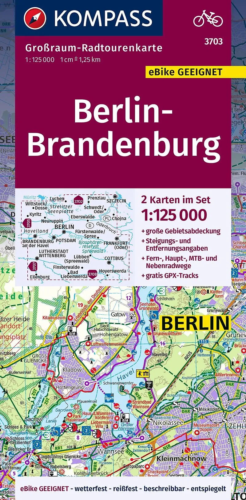 Großraum Fahrradkarte Berlin-Brandenburg Das Karten-Set bietet die perfekte Kombination aus Information und Übersichtlichkeit für eine große Region: 2 Karten im Set Maßstab 1:125 000 Fahrradwege mit Symbolen und Namen in der Legende Entfernungsangaben Steigun...