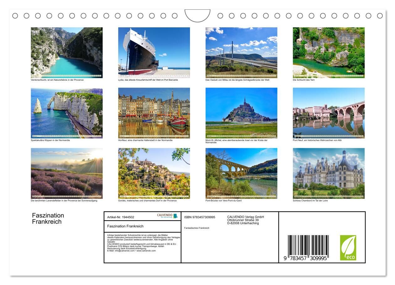 Entdecken Sie das zauberhaftes Frankreich. Die faszinierende Verbindung von Natur und Architektur. Jeder Monat zeigt ein atemberaubendes Bild, das die malerischen Landschaften und beeindruckenden Bauwerke Frankreichs in voller Pracht zeigt. Von den sanften Hüg...