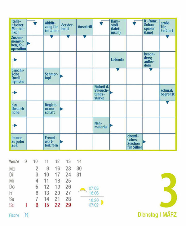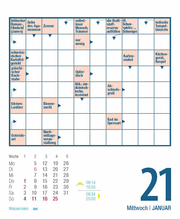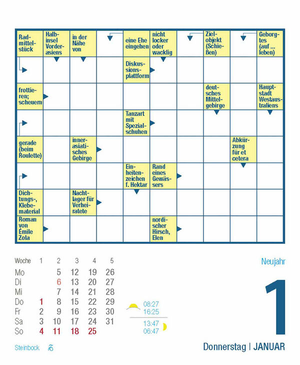 Mit diesem Kalender trainieren Sie täglich Ihre Gehirnzellen und werden mit spannenden Kreuzworträtseln bestens unterhalten. Und wenn Sie mal nicht weiterwissen: Auf der Rückseite finden Sie die Lösung. Kalender zum Aufstellen oder Aufhängen. Je Wochentag ein...