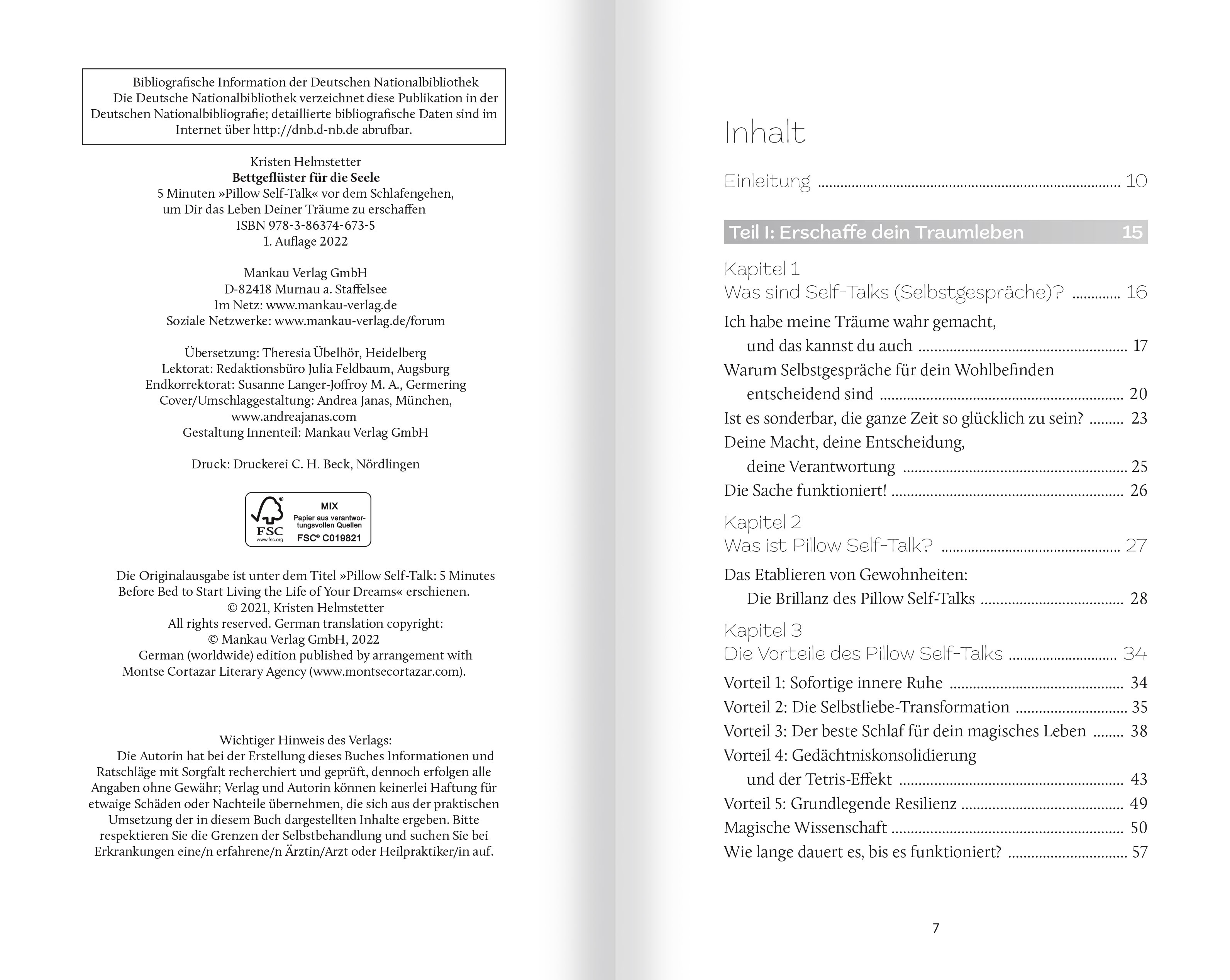 Fünf Minuten am Abend für ein Traumleben am Tag! Ein traumhaftes Leben durch fünf Minuten Selbstgespräch vor dem Einschlafen? "Bettgeflüster für die Seele" ist deine magische kleine Auszeit, um dich von der Hektik des Tages befreien, Herz und Verstand wieder i...Fünf Minuten am Abend für ein Traumleben am Tag! Ein traumhaftes Leben durch fünf Minuten Selbstgespräch vor dem Einschlafen? "Bettgeflüster für die Seele" ist deine magische kleine Auszeit, um dich von der Hektik des Tages befreien, Herz und Verstand wieder in Einklang zu bringen und dir zu kuscheligem, gesundem, erholsamem Schlaf und wohligen Träumen zu verhelfen. Wertvolle Impulse und Affirmationen unterstützen dich dabei. Denn wenn du gut schläfst und träumst, erwachst du nicht nur frisch gestärkt und bist bereit für einen neuen Tag, sondern nimmst den Zauber der Nacht mit in das Leben, von dem du immer geträumt hast! Die Autorin des internationalen Bestsellers "Coffee Self-Talk" hat ein weiteres Buch verfasst, das dein Leben verändern kann: Nutze die entscheidenden Minuten vor dem Einschlafen, um deine innigsten Träume zu erspüren und sie wahr werden zu lassen! Von besonderen Zielen und Wünschen über Selbstwertgefühl, Vertrauen, Schönheit und Lebensfreude bis hin zum Umgang mit Ängsten und Sorgen bietet "Bettgeflüster für die Seele" alles, was du brauchst, um die Magie des Lebens in deinem Alltag umzusetzen. Beginne schon heute Abend damit, ein besseres und glücklicheres Leben zu führen, großartige Menschen, Dinge und Erfahrungen anzuziehen, mehr Freude, Gelassenheit und Entspannung zu finden. Erschaffe dir das Leben, von dem du immer geträumt hast, wie im Schlaf!