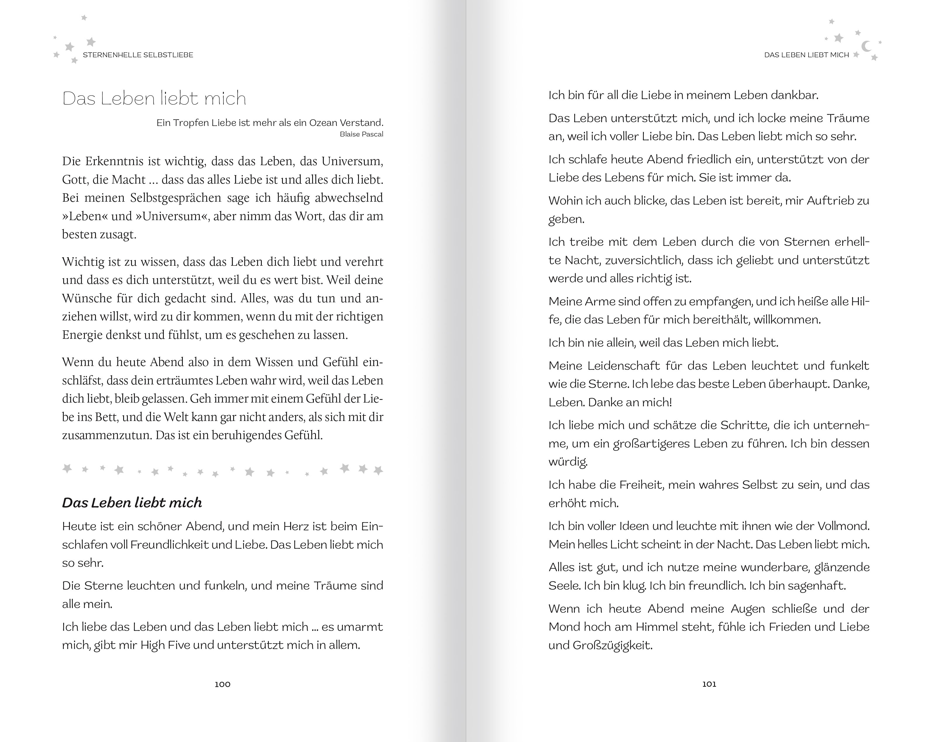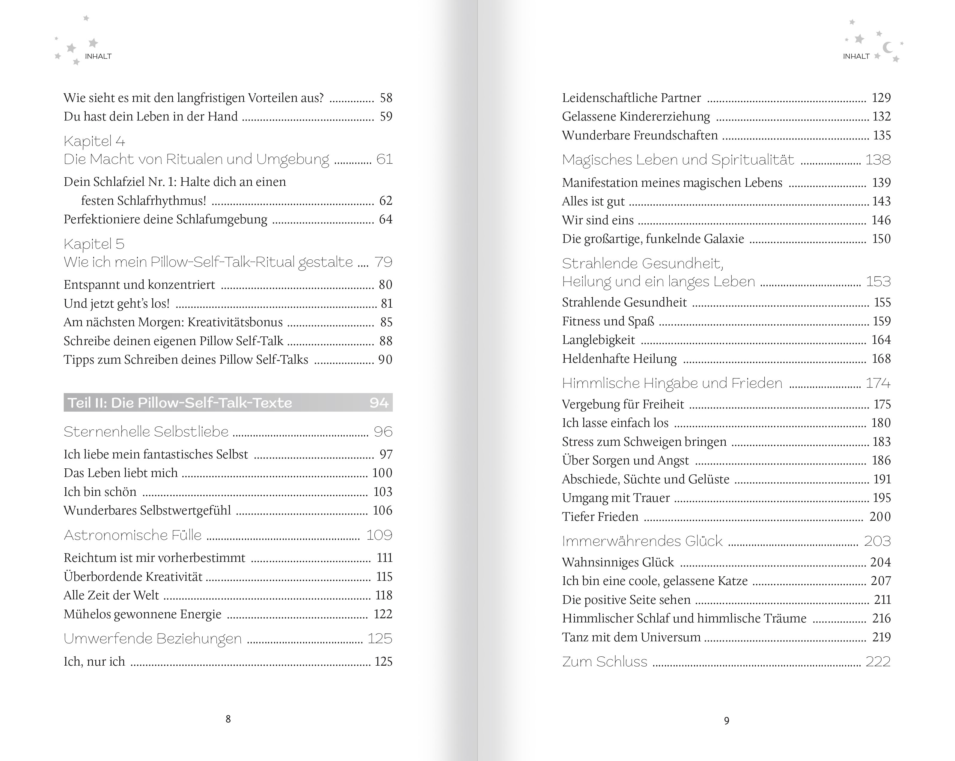 Liebe Leserin, lieber Leser, ich freue mich riesig, dass du dich mir bei diesem Abenteuer anschließt, mithilfe von Pillow Self-Talk das Leben, von dem du immer geträumt hast, zu führen und dir deine Herzenswünsche zu erfüllen. Willkommen! Mach dir, wenn du willst, eine Tasse entspannenden Kamillentee und lass uns beginnen. Vor einem Jahr habe ich das Buch "Coffee Self-Talk" (auf Deutsch: Auf einen Kaffee mit dir selbst) verfasst, in dem ich den einfachen, aber wirkungsvollen Prozess beschrieb, wie du täglich fünf Minuten mit einer köstlichen Tasse Kaffee nutzen und beginnen kannst, ein magisches Leben zu führen. In diesem Buch habe ich beschrieben, dass mein Leben auf dem Papier zwar super aussah - meine Familie war liebevoll, gesund und erfolgreich -, dass aber etwas fehlte. Meinem Leben fehlte der tiefere Sinn. Ihm fehlte das Funkeln. Ihm fehlte der Glanz, es gab keine Magie. So war es, bis ich mit meinem täglichen Ritual, dem Coffee Self-Talk, anfing, und dann Bumm! Innerhalb weniger Tage änderte sich alles. Bis heute haben mehr als hunderttausend Menschen dieses Buch gelesen. Viele schreiben mir, und häufig fragen sie mich, ob ich denn auch eine Self-Talk-Routine vor dem Zubettgehen habe. Die habe ich. Ich nenne sie "Pillow Self-Talk". Ich nutze sie, um am Ende des Tages runterzukommen. Das ist meine bevorzugte Art und Weise, meinen Geist zu beruhigen und mich in einem glückseligen Zustand zu entspannen, damit ich problemlos einschlafen, wunderbar träumen und am Morgen aufwachen kann - und mich dabei fantastisch und bereit fühle, es mit der Welt aufzunehmen. Dieses spezielle abendliche Ritual richtet mein Herz und meinen Geist so aus, dass sie mir selbst im Schlaf helfen, mein Leben und meine Träume zu manifestieren. (...) Durch die Lektüre dieses Buches und durch dein Bettgeflüster wirst du erfahren, weshalb der Abend seine eigenen magischen Kräfte in Bezug auf Selbstgespräche besitzt und wie du diese besondere Zeit nutzen kannst, um schneller zu einem sagenhaften Leben zu finden - wie eine Rakete, die in den nächtlichen Sternenhimmel startet. Und genau das hältst du in diesem Moment in den Händen: einen supereinfachen Prozess, mit dem du heute Abend beginnen kannst, um ein besseres und glücklicheres Leben zu führen, um fantastische Dinge, Menschen und Erlebnisse anzuziehen und mehr Glück, Ruhe und Entspannung zu finden. Durch dieses Buch wirst du von der immensen Bedeutung der Selbstgespräche erfahren und warum diese dein Leben verändern werden. Du wirst die perfekte Abendroutine kennenlernen, um dich auf den Schlaf vorzubereiten, dich gut zu fühlen und zu relaxen und mühelos in friedliche Entspannung zu finden, während du ins Traumland driftest. In diesem Buch werden mehrere Themen für dein Bettgeflüster vorgestellt, dazu zählen: - Sternenhelle Selbstliebe - Astronomische Fülle - Umwerfende Beziehungen - Magisches Leben und Spiritualität - Strahlende Gesundheit, Heilung und ein langes Leben - Himmlische Hingabe und Frieden - Ewiges Glück Jeder dieser Abschnitte enthält spezielle Ziele und Träume - von der Entdeckung deiner eigenen Schönheit und Bedeutung über das Geldverdienen und das Erreichen der besten Form deines Lebens sowie das Führen der fantastischsten Beziehungen bis hin zur Thematisierung von Angst, Stress und Trauer. Deshalb schüttle dein Kissen auf und schlüpfe unter die Bettdecke. Kuschel dich ein und nimm einen langen, tiefen Atemzug. Los geht's! Ich wünsche dir süße Träume! Kristen Helmstetter