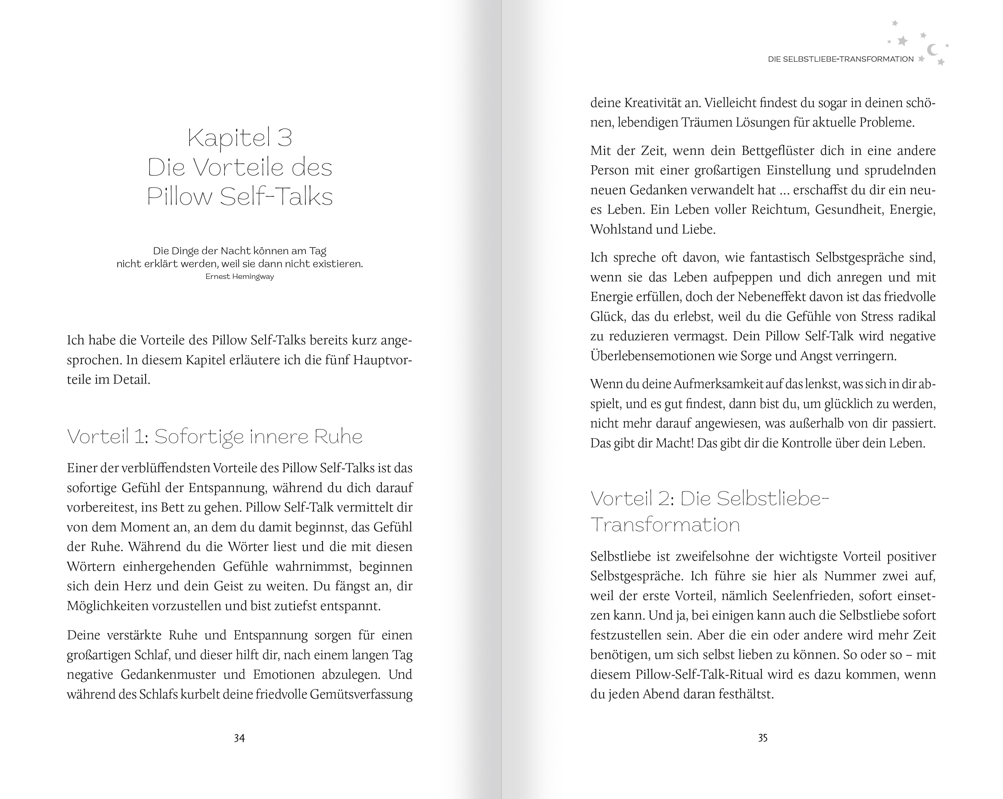 KAPITEL 3: DIE VORTEILE DES PILLOW SELF-TALKS "Die Dinge der Nacht können am Tag nicht erklärt werden, weil sie dann nicht existieren." Ernest Hemingway Ich habe die Vorteile des Pillow Self-Talks bereits kurz angesprochen. In diesem Kapitel erläutere ich die fünf Hauptvorteile im Detail. VORTEIL 1: Sofortige innere Ruhe Einer der verblüffendsten Vorteile des Pillow Self-Talks ist das sofortige Gefühl der Entspannung, während du dich darauf vorbereitest, ins Bett zu gehen. Pillow Self-Talk vermittelt dir von dem Moment an, an dem du damit beginnst, das Gefühl der Ruhe. Während du die Wörter liest und die mit diesen Wörtern einhergehenden Gefühle wahrnimmst, beginnen sich dein Herz und dein Geist zu weiten. Du fängst an, dir Möglichkeiten vorzustellen und bist zutiefst entspannt. Deine verstärkte Ruhe und Entspannung sorgen für einen großartigen Schlaf, und dieser hilft dir, nach einem langen Tag negative Gedankenmuster und Emotionen abzulegen. Und während des Schlafs kurbelt deine friedvolle Gemütsverfassung deine Kreativität an. Vielleicht fin…