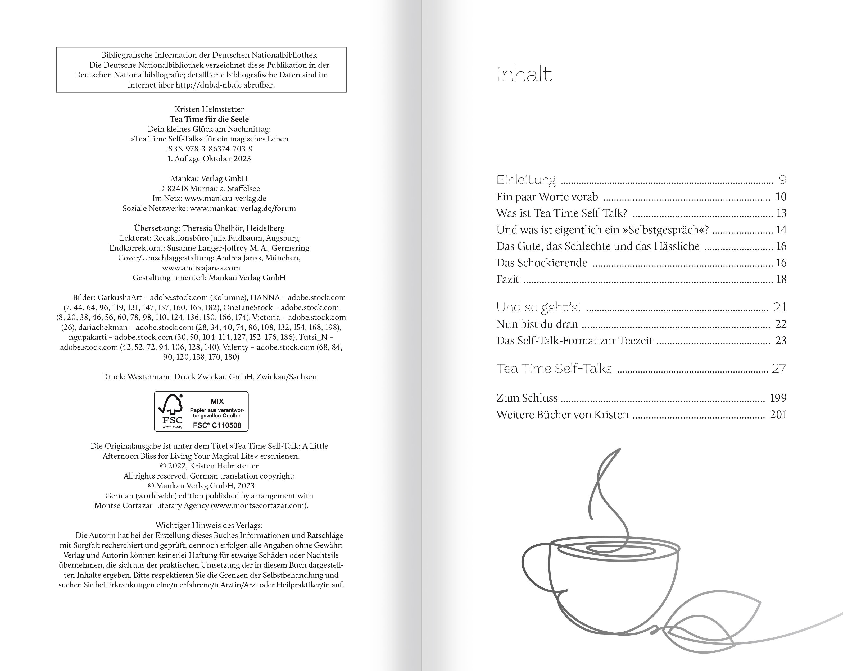 INHALT EINLEITUNG Ein paar Worte vorab Was ist Tea Time Self-Talk? Und was ist eigentlich ein "Selbstgespräch"? Das Gute, das Schlechte und das Hässliche Das Schockierende UND SO GEHT'S! Nun bist du dran Das Self-Talk-Format zur Teezeit TEA TIME SELF-TALKS Zum Schluss Weitere Bücher von Kristen