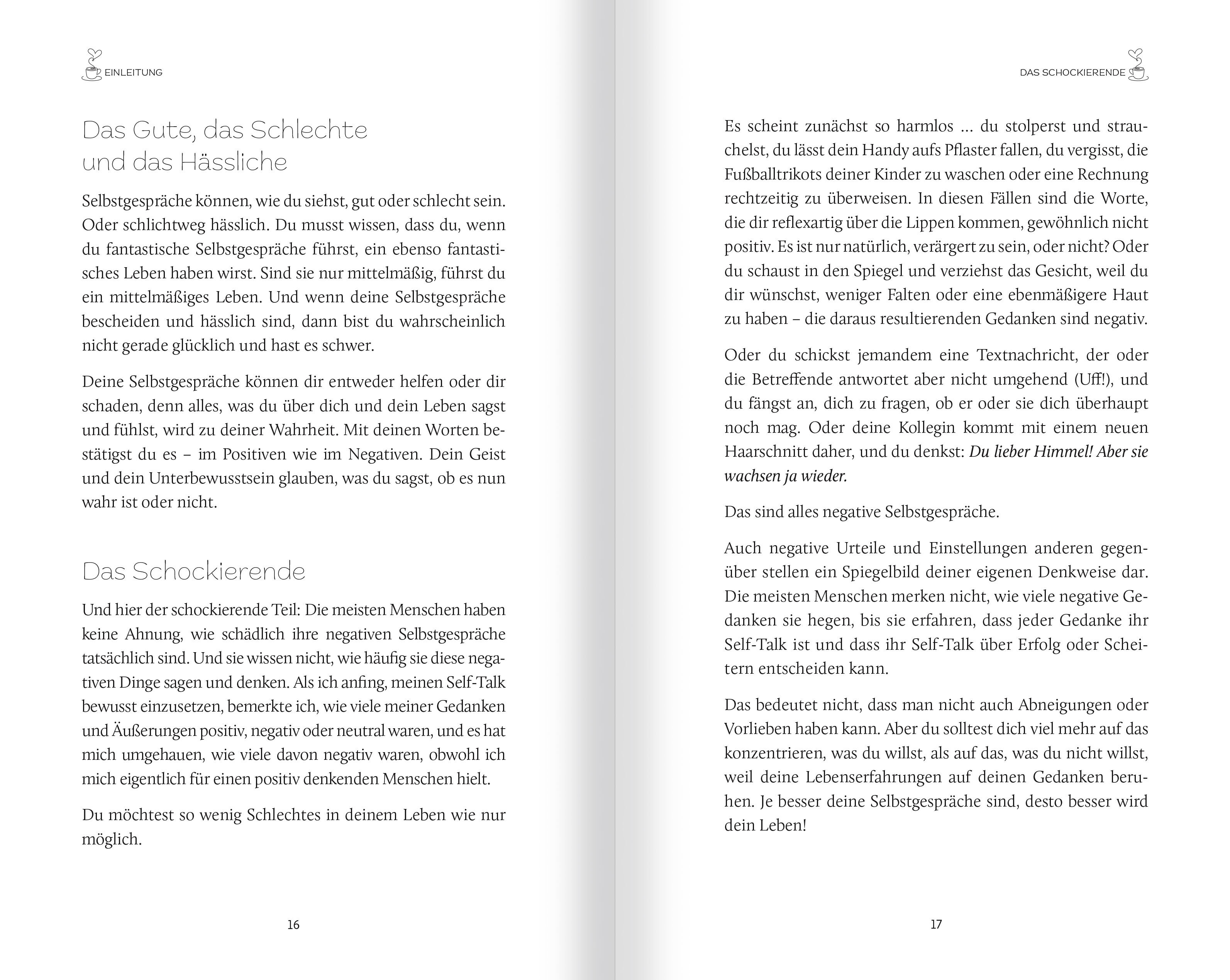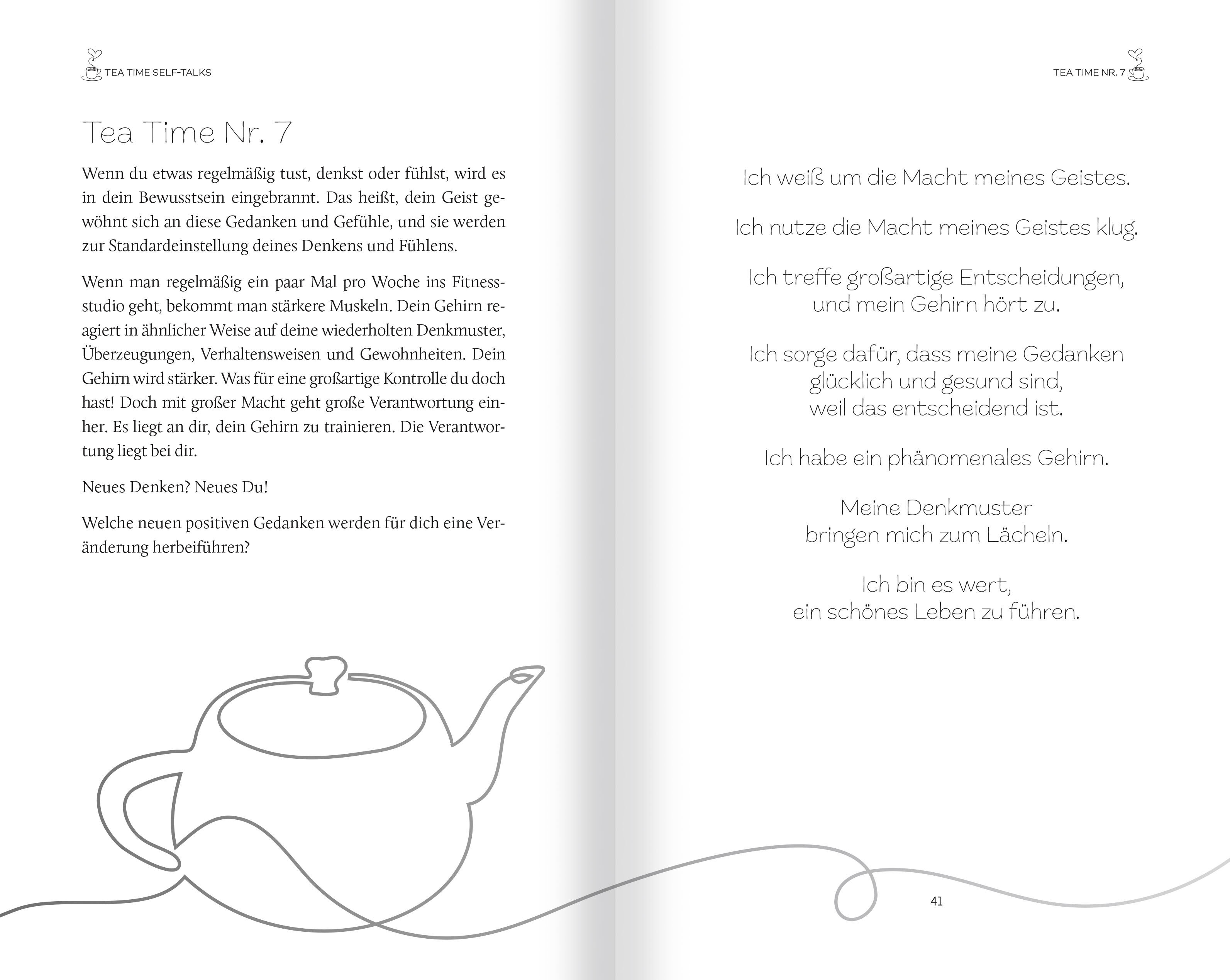 EIN PAAR WORTE VORAB Vor ein paar Jahren war ich kein allzu glücklicher Mensch. Obwohl ich ein Leben führte, das viele Menschen vielleicht großartig gefunden hätten, hielt ich persönlich es nicht für großartig und wachte stattdessen jeden Morgen mit dem Gefühl auf, unter einer dunklen Wolke zu leben. () Wir haben alle Probleme, nicht wahr? So ist das Leben nun einmal. Doch etwas nagte jahrelang in mir. Als würde das Schicksal oder eine kleine Fee mir etwas ins Ohr flüstern: "So muss das Leben nicht sein. Du solltest viel öfter lächeln. Eigentlich sollten wir mehr Spaß haben. Glück, Freude. Ja sogar Magie erleben." Deshalb probierte ich verschiedene Dinge aus, damit ich mich besser fühlte, doch erst als ich herausfand, wie wirksam meine Denkweise ist, veränderte ich meine Selbstgespräche, wodurch ich wiederum mein Leben in eine andere Richtung lenken konnte. Die dunklen Wolken begannen, sich aufzulösen, die Sonne kam hervor. Es dauerte nicht lange, und ich erlebte regelmäßig herrlich sonnige Tage. Diese fröhliche Stimmung war nun Normalität, und ich wurde ein ganz anderer, ein neuer Mensch. Und das alles nur aufgrund meiner Selbstgespräche. Das heißt, aufgrund der Worte und Gedanken, die ich über mich selbst, die Welt und mein Leben sagte und dachte. Doch meine neue, fröhliche Stimmung war nur der Anfang. Mit dieser Veränderung meiner Einstellung begann ich, kühne Entscheidungen zu treffen, zu handeln und in meinem Leben erstaunliche Dinge zu manifestieren - von Fülle bis zur Liebe - und das alles mit einer Menge Motivation, Zielgenauigkeit und unglaublicher Gemütsruhe. Hätte ich gewusst, dass meine Selbstgespräche mein Leben so dramatisch verändern würden, hätte ich schon vor Jahrzehnten damit angefangen. (...) Tea Time für die Seele ist neu und anders! Für alle, die mit Selbstgesprächen noch nicht aktiv arbeiten, gebe ich einen kurzen Überblick, dann springen wir direkt zu dem, was ich als Tea Time Self-Talk bezeichne - zu kurzen, vorformulierten und inspirierenden Auszeiten, die sich perfekt für eine fünfminütige Nachmittagspause eignen oder für jeden Zeitpunkt, an dem du dir ein paar Minuten Glück gönnen willst, um Atem zu schöpfen, deine Mitte zu finden und die Schönheit deines magischen Lebens wertzuschätzen. Wie du dir sicher vorstellen kannst, liebe ich meine positiven Selbstgespräche. Deshalb nutze ich diese Macht, um meinen Geist regelmäßig, das heißt täglich zu programmieren. Denn das ist das Entscheidende - es so regelmäßig zu tun, dass es in Fleisch und Blut übergeht und es zur täglichen Routine wird. Diese Regelmäßigkeit führt dazu, dass sich die gewünschten Lebensveränderungen rasch einstellen. Das macht den Unterschied aus: Du trainierst dein Gehirn, anders zu denken. Wenn du das regelmäßig machst, veränderst du dein Leben. Du verwandelst dich. Du findest Glück, wie du es noch nie zuvor erlebt hast weil es wirkt. (...) Nun habe ich festgestellt, dass ich zwischen 14 und 16 Uhr meist ein Tief habe und mich hin und wieder beim Gähnen ertappe. Eine Tasse Tee hat sich als bester Muntermacher erwiesen, und ich trinke sie gewöhnlich an meinem Schreibtisch, während ich weiterarbeite. Doch als mir nach ein paar Wochen klar wurde, dass dieser Nachmittagstee gewissermaßen ein neues Ritual werden konnte, erkannte ich die Chance, damit ein paar gute, kühne Selbstgespräche zu verbinden. Ich begann, diese Zeit als offizielle Nachmittagszeremonie zu nutzen, um mir diesen wunderbaren kleinen Energieschub zu gönnen (also Teein plus Worte) und meine fröhliche Stimmung zu stärken, damit ich meine Aufgaben und meinen Tag mit einem Lächeln beenden konnte.(...)