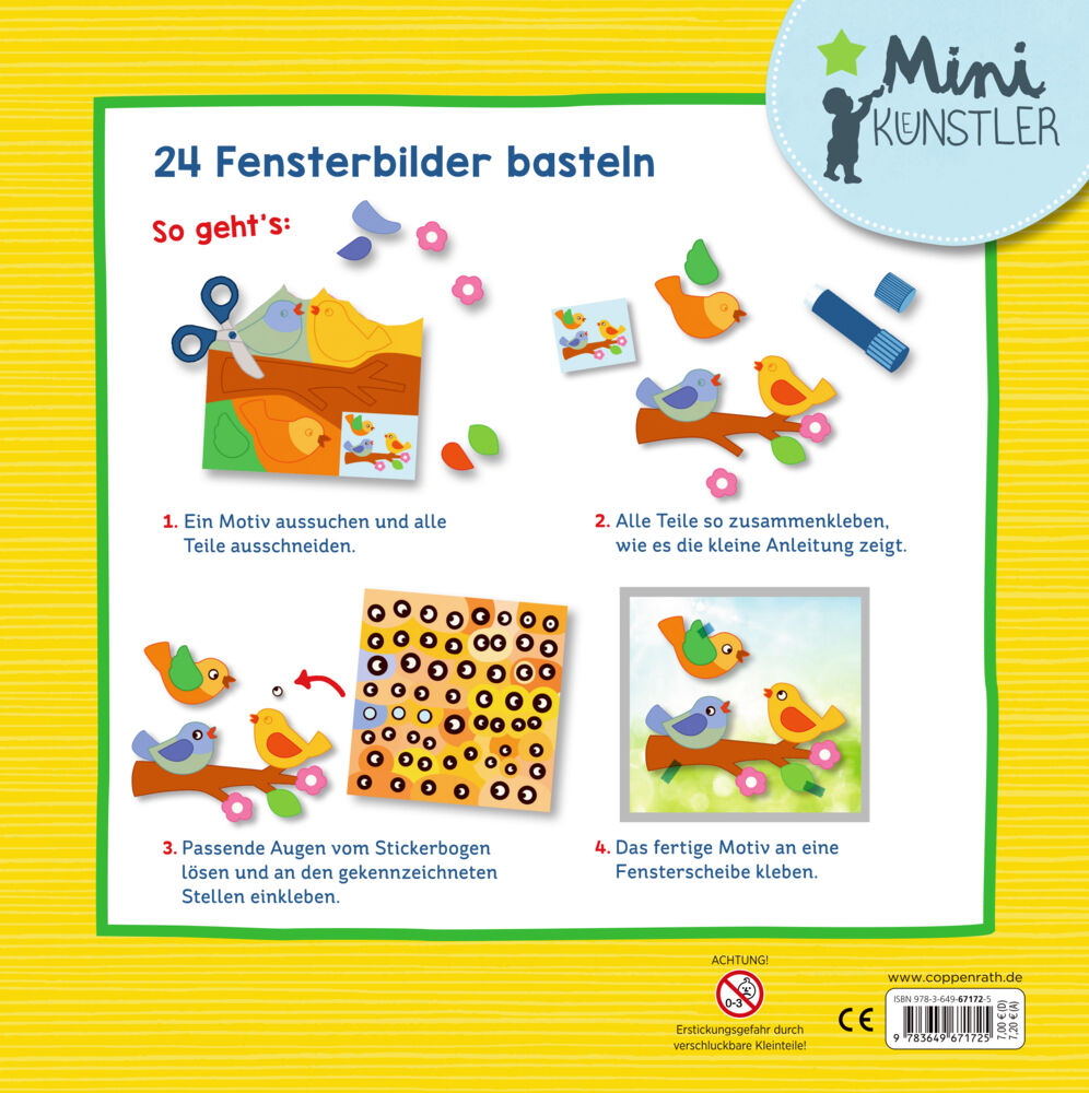 24 Fensterbilder basteln - so geht's: 1. Ein Motiv aussuchen und alle Teile ausschneiden. 2. Alle Teile so zusammenkleben, wie es die kleine Anleitung auf jeder Seite zeigt. 3. Passende Augen vom Stickerbogen lösen und an den gekennzeichneten Stellen einklebe...