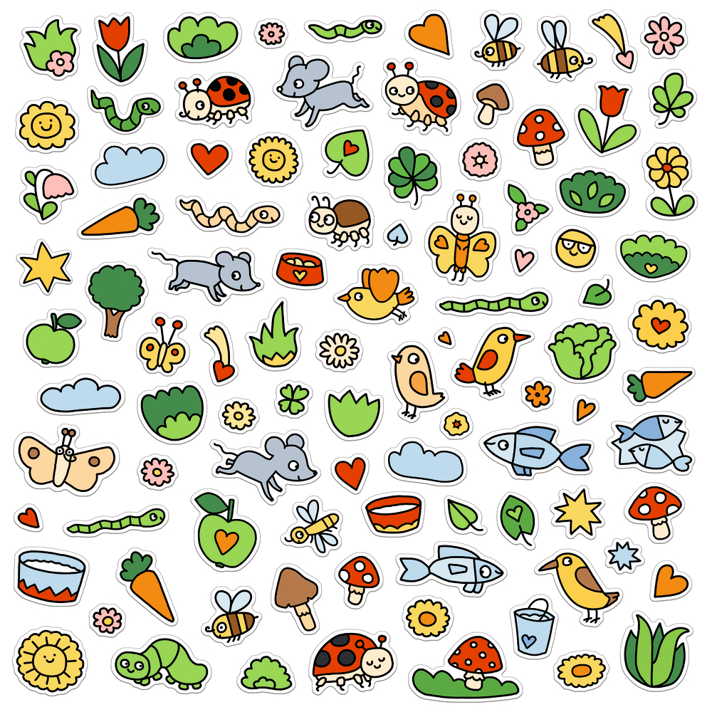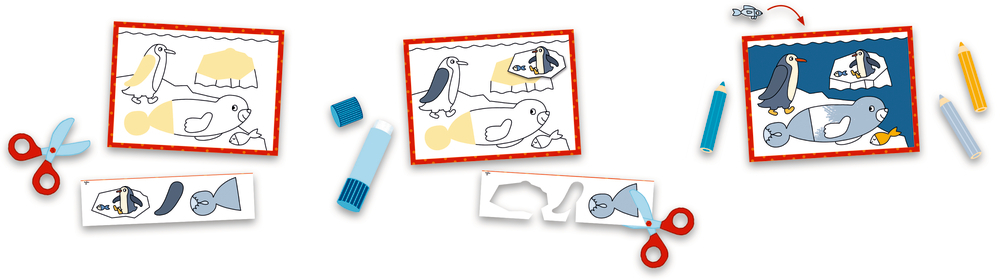 24 Bilder zum Ausmalen und Basten - so geht's: 1. Eine Seite aus dem Block lösen und den Streifen abschneiden. 2. Die Motive auf dem Streifen ausschneiden und an den vorgegebenen Stellen ins Bild kleben. 3. Den Rest nach Lust und Laune bunt anmalen und das Bi...