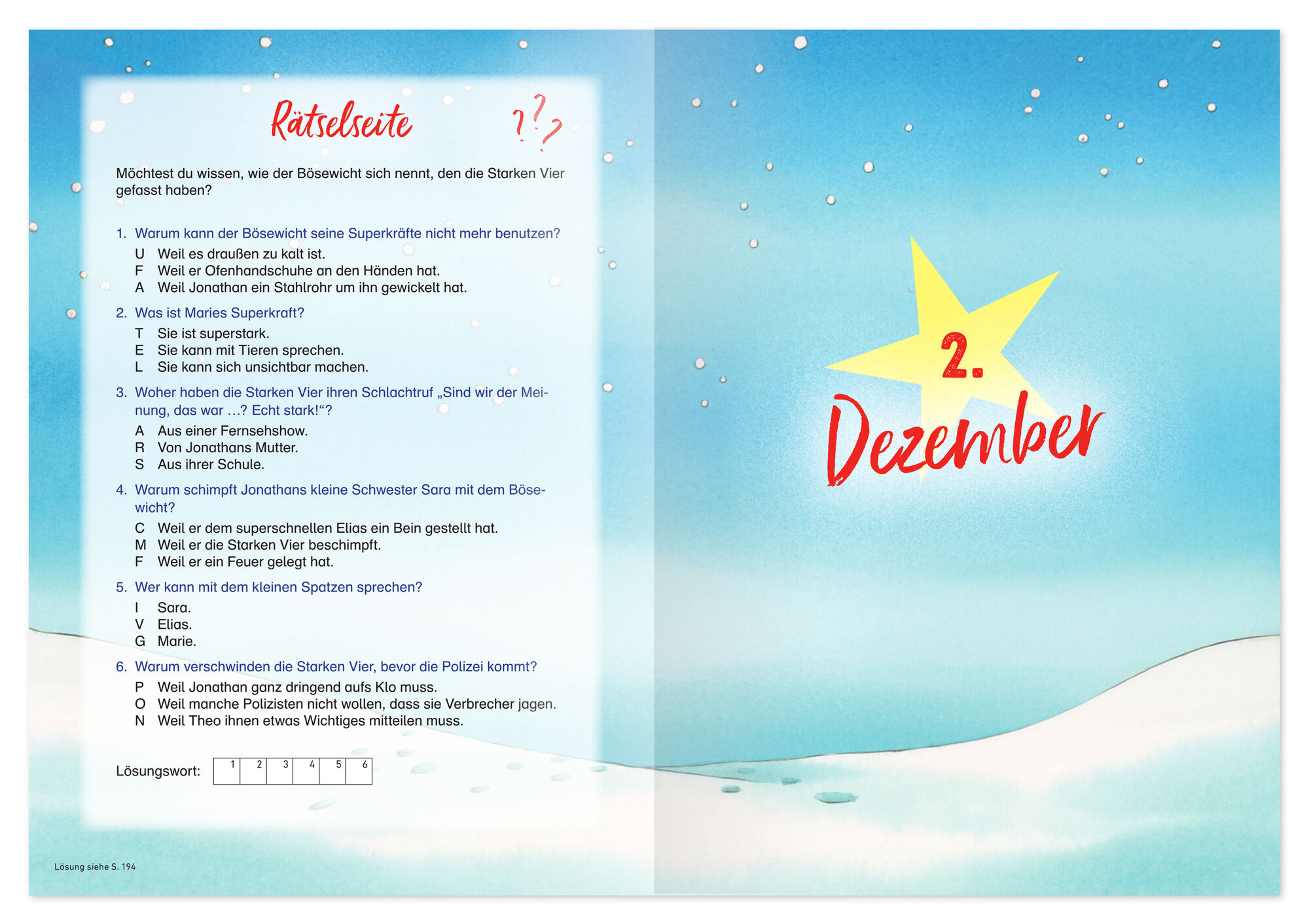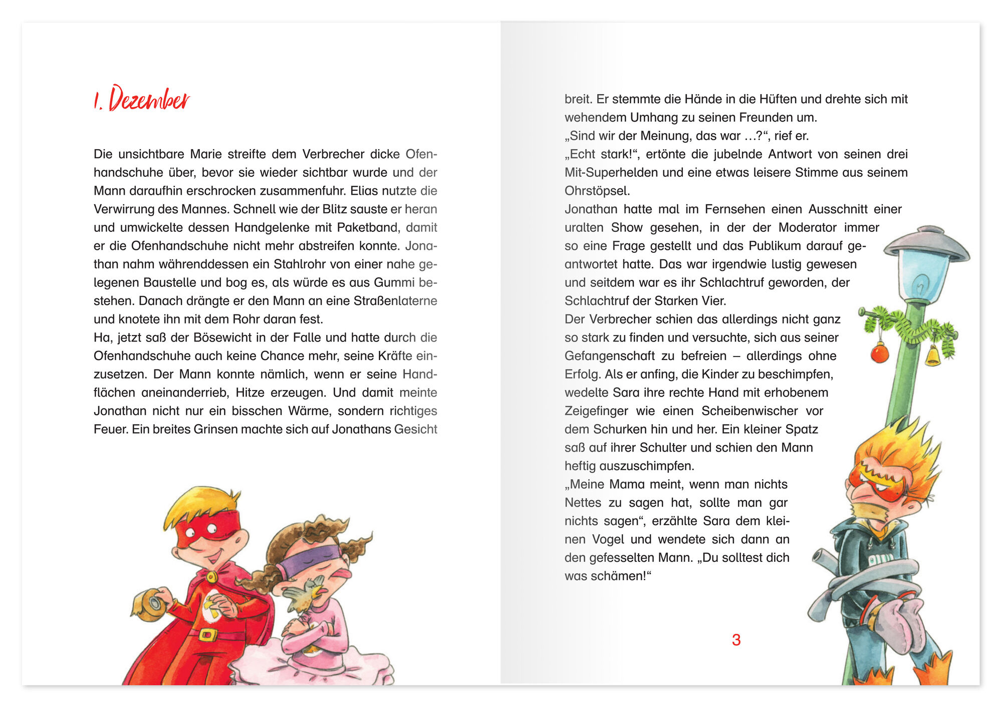Ein Superhelden-Adventskalender als Adventskalenderbuch zum Lesen und Rätseln für Kinder ab 8 Jahren. Jonathan, Sara, Marie und Elias sind, seit sie ihre Superkräfte haben, richtige kleine Helden geworden. Gerade als sich eine kleine Pause für die starken Vier...