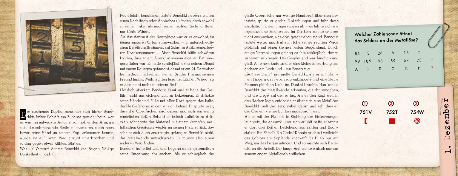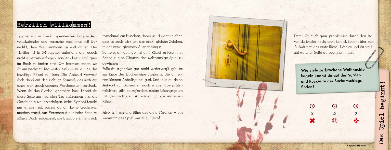 Ein Escape-Adventskalender für Krimi- und Rätselfans: In den 24 Kapiteln dieses Adventskalender-Buchs wird die spannende Escape Room Story erzählt. Nach jedem Abschnitt muss ein Rätsel gelöst werden um weiterzukommen und hoffentlich letztendlich zu fliehen. Ei...