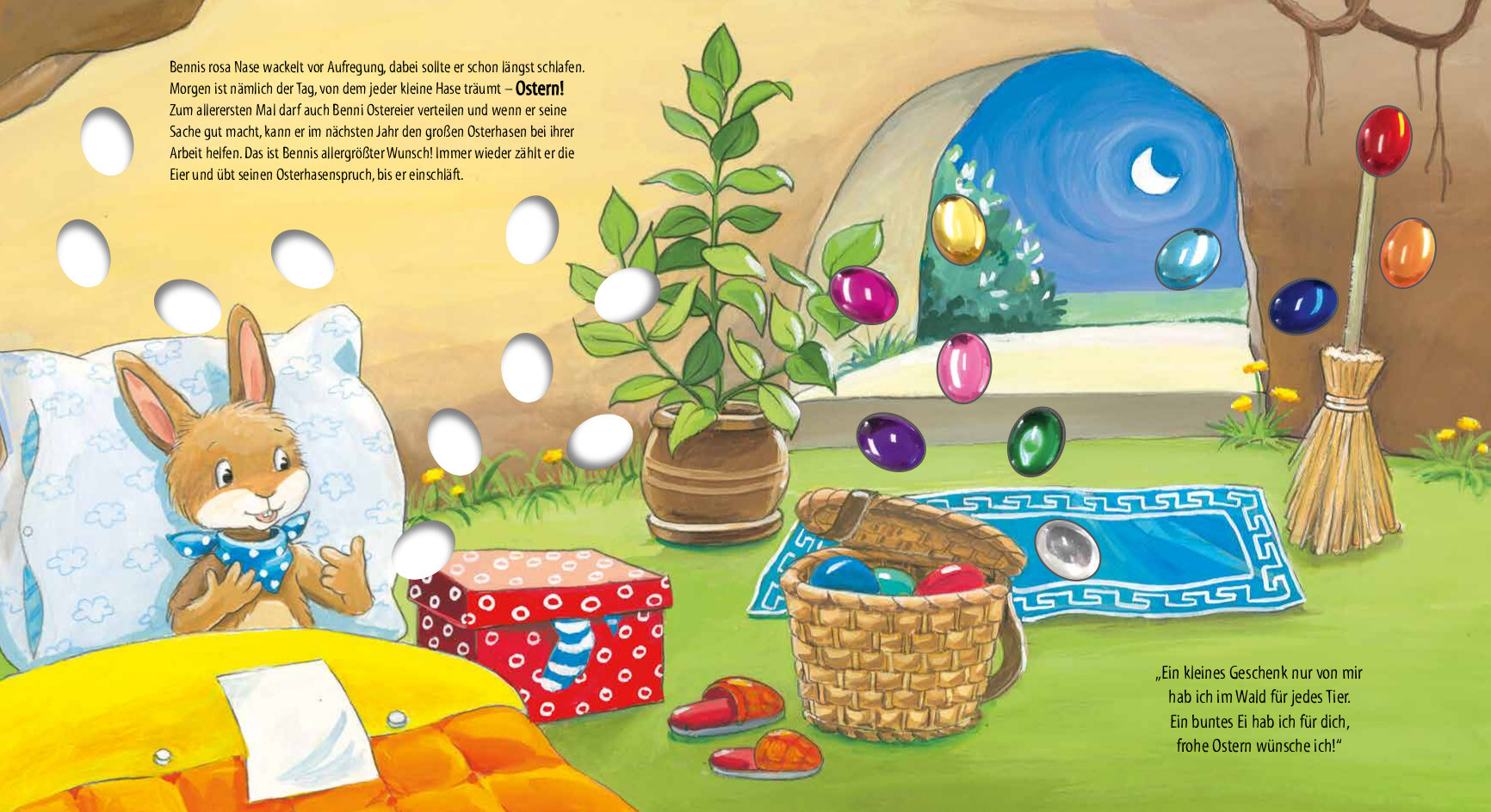 Ein lustiges Kinderbuch zu Ostern - ein Bilderbuch mit Glitzersteinen für Kinder ab 4 Jahren: Benni ist ja so aufgeregt! Zum allerersten Mal darf der kleine Hase auch ein paar Ostereier verteilen. Und wenn er seine Sache gut macht, wird er im nächsten Jahr sog...