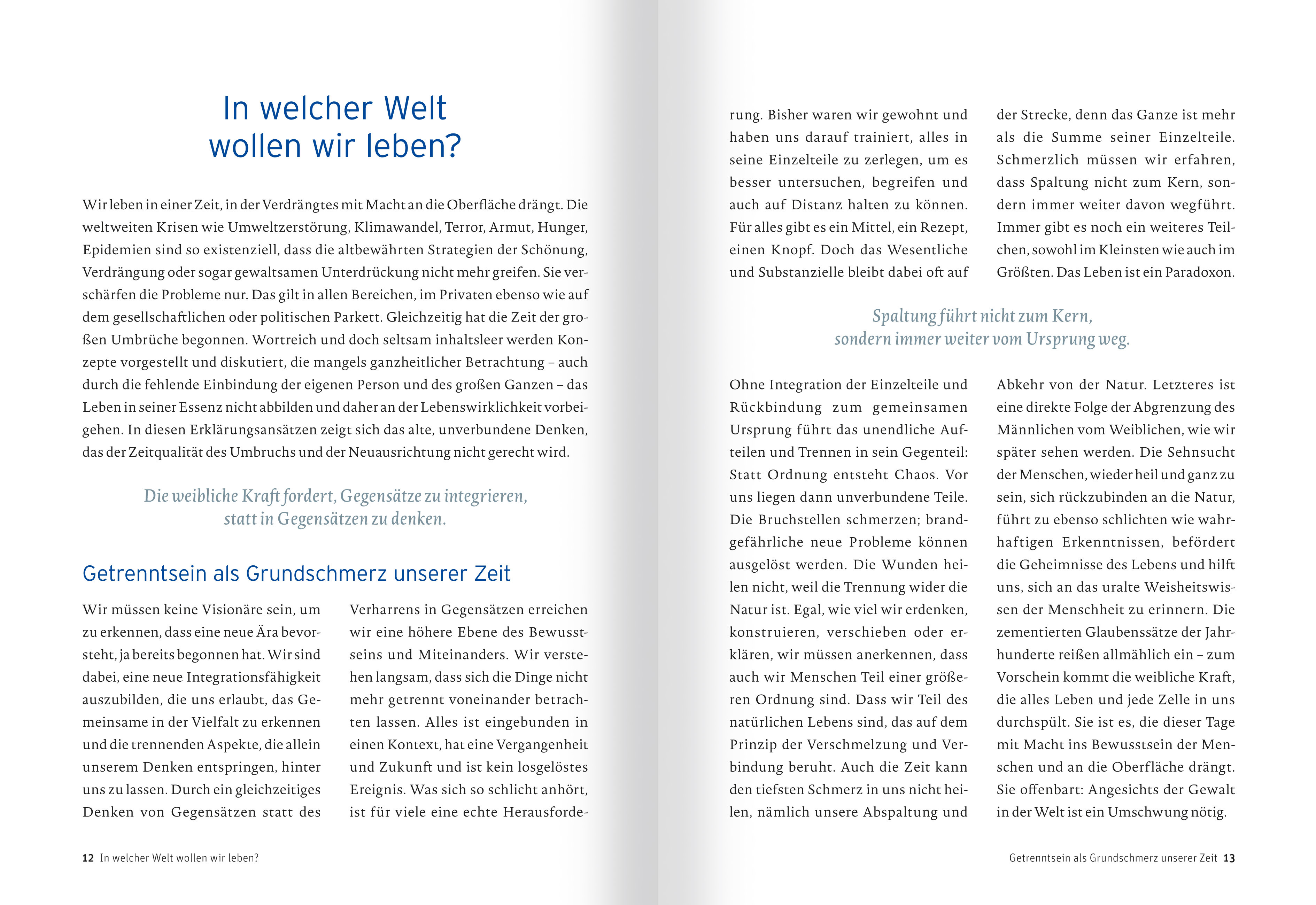 ((Auszug aus dem Kapitel Freiheit für die weibliche Kraft im 21. Jahrhundert)) Die Gleichberechtigung springt zu kurz Was ist weiblich, was ist männlich? Diese Frage heute noch zu stellen, findet sicher nicht jede/r zeitgemäß. Denn haben nicht vor 40 Jahren Feministinnen und dann Wissenschaftler lang und breit dieses Thema beackert - ohne zielführende Ergebnisse? Ich sage: Kein Zeitpunkt ist besser geeignet als der heutige. Denn die Welt befindet sich in einer Phase des Umbruchs, taumelt und sucht nach Wegen in eine lebenswerte Zukunft. Dazu gibt es erstmals eine Generation junger Frauen, die ohne Einschränkungen aufwachsen konnten, in ihrem Selbstwert, ihren Stärken und Talenten gefördert wurden, die sich ihr Leben nach ihren Wünschen ausrichten konnten und keinem Rollenklischee entsprechen mussten. Frei von Erwartungen, nur sich selbst verantwortlich. Und auch wenn sich die neue Freiheit hier und da noch etwas eng anfühlt, etwa mit Blick auf die Vereinbarkeit von Beruf und Familie, Lohn-Gap oder die paritätische Verteilung von Frauen und Männern in Führungspositionen, so stellt das für viele Menschen ein Klagen auf hohem Niveau dar und keinen Grund für feministische Parolen. Und mag es auch unser gutes Recht sein, das Erreichte auszukosten und Vergangenheit Vergangenheit sein zu lassen, so entspringt in meinen Augen daraus doch auch eine Verantwortung für uns junge Frauen: Nutzen wir die gewonnene Freiheit, um intuitiv und wahrhaftig zu fragen, was weiblich sein im Kern bedeutet! Lasst uns eine Antwort aus dem eigenen Selbst-Bewusstsein, dem eigenen Spüren heraus, ohne Zwänge von außen finden. Dies alles ist grundlegend für das Leben, das aus der Verschmelzung von Mann und Frau entsteht, aber auch für unsere Gesellschaft. Im Grunde lässt sich jedes gesellschaftliche Streben auf Fragen der eigenen Identität, auf sexuelle oder familiäre Energien zurückführen und ist damit an das Geschlecht gebunden. Doch auf diesem für das Zusammenleben der Menschen so wichtigen Gebiet herrscht Ahnungslosigkeit, Unwissenheit und Verwirrtheit. Seit den Sechzigerjahren verdauen wir in der westlichen Welt die Erkenntnis, dass es sogar aus biologischer Sicht nicht immer einfach ist, eine geschlechtliche Zuordnung von Personen vorzunehmen. Das Geschlecht ist eher ein Kontinuum, die Geschlechtsbestimmung lässt Varianzen zu und ist nicht immer eine Punktentscheidung. Seither wird oft die Meinung vertreten, das Geschlecht sei vor allem sozial konstruiert. Es gebe keinen wesentlichen Unterschied zwischen Mann und Frau; allein Sozialisation und geschlechtliche Prägung durch die Eltern und das gesel…