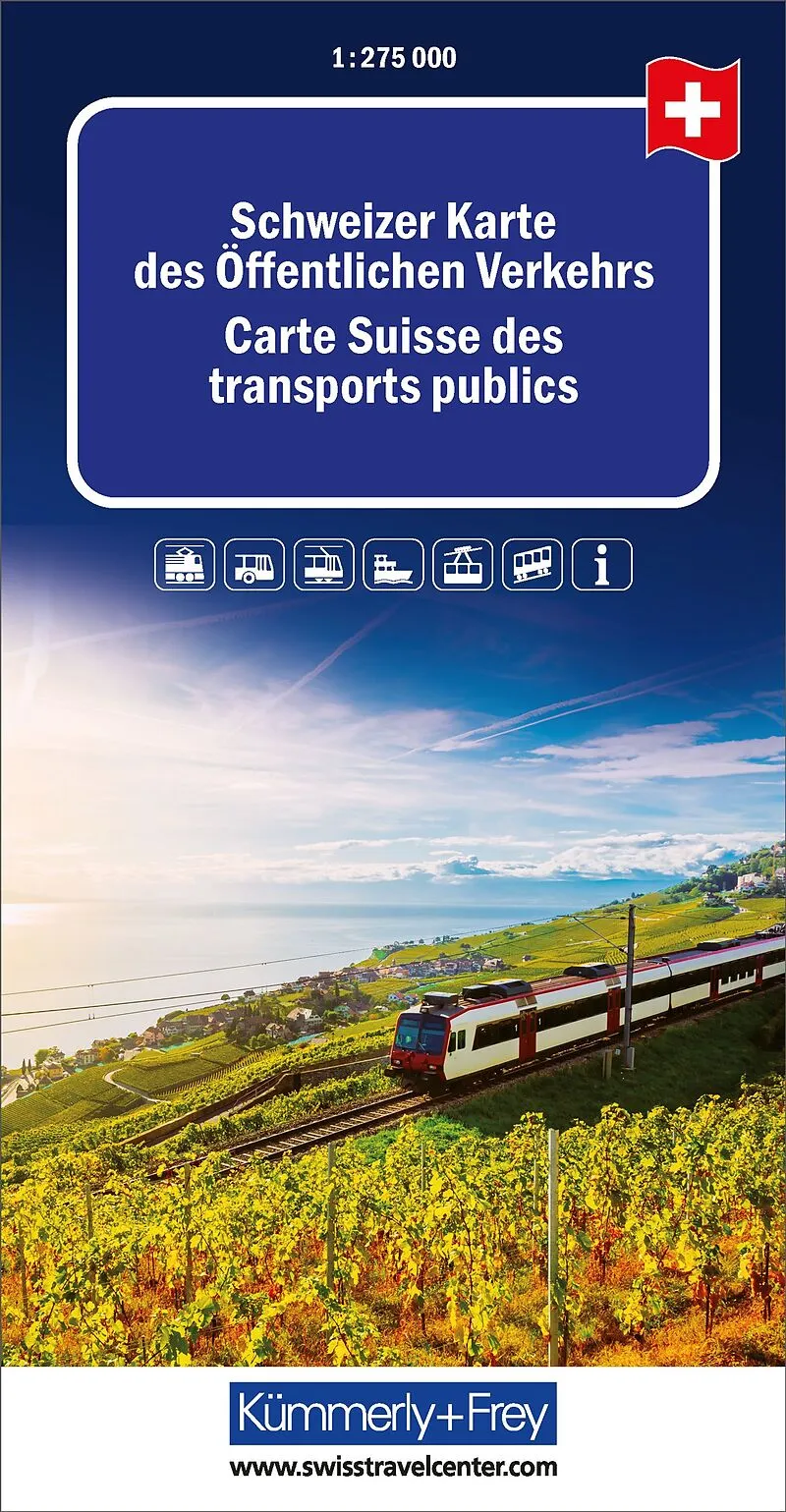 In der Kümmerly+Frey Karte des Öffentlichen Verkehrs 1:275 000 ist das gesamtschweizerische Eisenbahnnetz detailliert abgebildet. Von Bern, Zürich, Basel, Lugano, Genf, Lausanne, Biel, Locarno, Sion, Zermatt, Gstaad bis Laax sind alle Gebiete und Städte mit a...