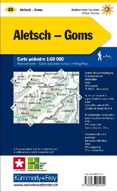 In der Kümmerly+Frey Wanderkarte Aletsch - Goms im Massstab 1:60 000 finden Sie alles, was Sie zur Orientierung und Inspiration brauchen. Die Karte zeigt von Lauterbrunnen, Jungfrau, Ulrichen, Oberwald, Grimselpass, Furkapass, Fiesch, Belalp, Visp, Brig, Bett...