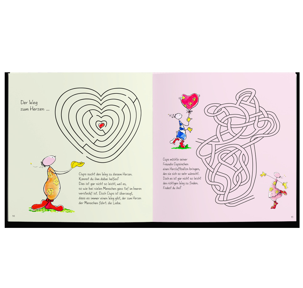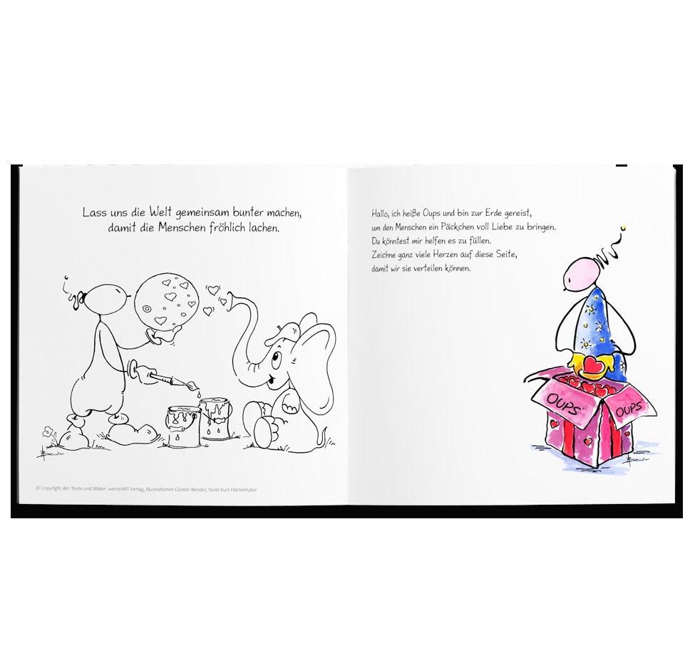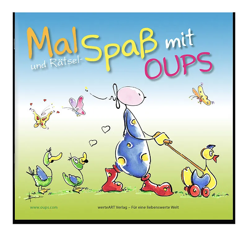 Dieses liebenswerte Malbuch enthält Bilder zum aus- an- und dazumalen, Seiten mit Rätseln, einem Mandala und Suchbild. © werteArt Verlag, Illustration: Günter Bender, Texte: Kurt Hörtenhuber Urheberin Figur Oups: Conny Wolf