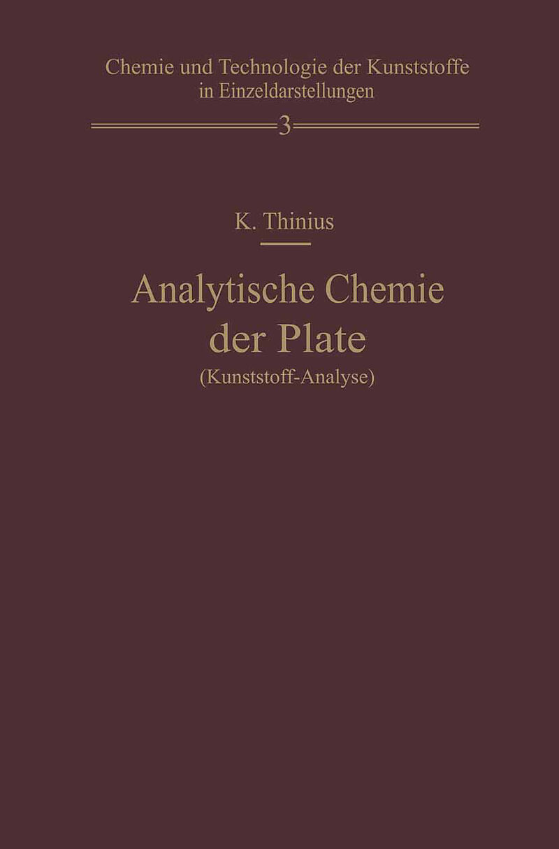 Analysengang.- A. Gebräuchliche Methoden zur Untersuchung der Ausgangsmaterialien und Hilfsmittel für die Herstellung der Plast-Rohstoffe.- I. Ausgangsmaterialien für die Plast-Rhstoffe auf der Grundlage er Cellulose.- II. Ausgangsmaterialien für Plast-Rohstoffe auf tierischer oder pflanzlicher Grundlage außer Cellulose.- III. Ausgangsmaterialien für die Plast-Rohstoffe auf Basis der Polymerisations- und Polykondensationsprodukte.- B. Untersuchungsmethoden für die makromolekularen Rohstoffe der Plast-Herstellung.- I. Plast-Rohstoffe auf Cellulosebasis.- II. Plast-Rohstoffe auf tierischer und pflanzlicher Grundlage außer Cellulose und Kautschuk.- III. Durch Polymerisation gewonnene Plast-Rohstoffe.- IV. Durch Polykondensation gewonnene Plast-Rohstoffe.- C. Charakteristische, für die Analyse der Plaste verwertbare Eigenschaften der Plast-Rohstoffe.- I. Erkennungsmerkmale für die Plast-Rohstoffe aus der Gruppe der Cellulose und ihrer Derivate.- II. Erkennungsmerkmale für die Plast-Rohstoffe auf tierischer und pflanzlicher Grundlage außer Cellulose.- III. Erkennungsmerkmale für die Plast-Rohstoffe aus der Gruppe der Vinylpolymerisate.- IV. Erkennungsmerkmale für durch Polykondensation gewonnene Plast-Rohstoffe.- D. Analysenmethoden für die Verarbeitungshilfsmittel für die Plaste.- I. Analysenmethoden für Weichmachungsmittel.- II. Analysenmethoden für Füllstoffe.- E. Einige Erfahrungen über die praktische Durchführung von Plast-Analysen.- I. Methoden zur Abtrennung von Weichmachern aus Plasten.- II. Erfahrungen bei der Analyse von Plasten auf Basis Cellulose.- III. Erfahrungen bei der Analyse von Plasten auf der Grundlage von Naturstoffen außer Cellulose.- IV. Erfahrungen bei der Analyse von Plasten auf Polymerisat-Grundlage.