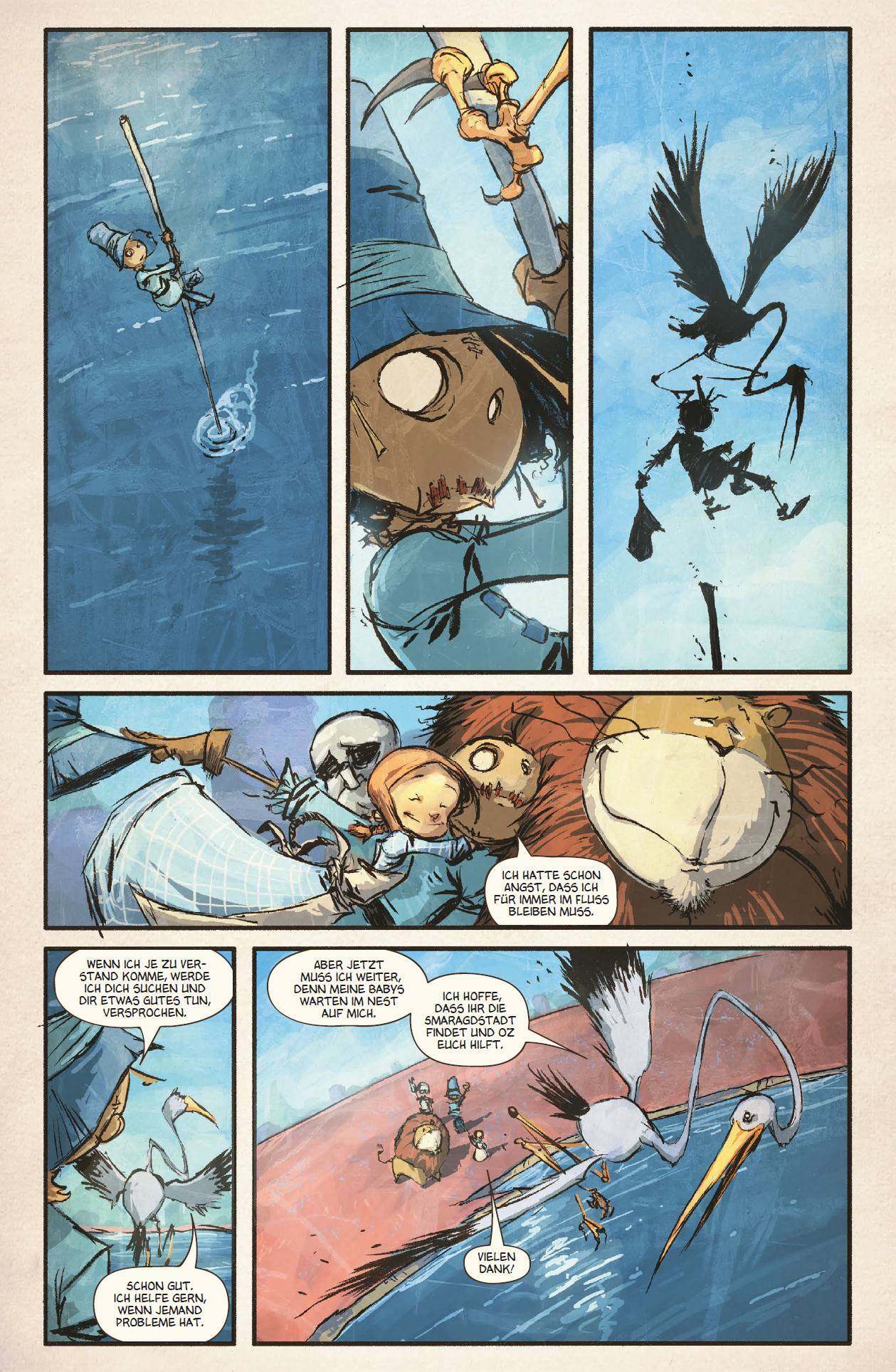 Ein hochwertiger, gebundener Band im Großformat sammelt die komplette Adaption des ersten Oz-Romans in Comicform. Mit einem umfangreichen Bonusteil mit vielen Skizzen und Erläuterungen, einem exklusiven Vorwort von Zeichner Skottie Young für die deutsche Ausgabe und einer Einführung von Alexander Bubenheimer, die nachfolgend ungekürzt wiedergegeben ist: Das smaragdgrüne Oz und seine deutschen Leser In einer Zeitspanne von nur fünfzehn Jahren entstanden zum Ende des 19. Jahrhunderts zwei zeitlose Klassiker der Kinderliteratur, die bis heute den Kanon der amerikanischen Lieblingsbücher anführen: Huckleberry Finn von Mark Twain und Lyman Frank Baums Wizard of Oz. Beide haben mehr gemein, als es auf den ersten Blick scheint hinter der Fassade des (kindgerechten) Abenteuers verbergen sich System- und Gesellschaftskritik, aber vor allem wurden sie von zahllosen Verlegern weltweit noch kindgerechter zurechtgestutzt und verstümmelt. Die Wiederentdeckung der originalen Texte lohnt sich ungemein, insbesondere beim Zauberer von Oz, auch um die im kollektiven Gedächtnis verankerten Bilder und Handlungsstränge zu ergänzen, für die Hollywood verantwortlich zeichnet, das in seinem goldensten Jahr 1939 einen grandiosen und mit zwei Oscars ausgezeichneten Musicalfilm mit Judy Garland auf die Leinwände schickte (über den Flop von Diana Ross und Michael Jackson Jahrzehnte später sollte dagegen besser der Mantel des Schweigens gebreitet werden). Interessant ist aber auch der Unterschied in Themen, Sprache und Gesellschaftsdenken zum anderen großen eskapistischen Kinderklassikers jener Tage, des fünfunddreißig Jahre älteren Alice im Wunderland. Die Unterschiede zwischen britischer und amerikanischer Mentalität sind kaum einfacher herauszustellen als im direkten Vergleich dieser Werke aus der oberen britischen Mittelschicht und dem bodenständigen amerikanischen Urvertrauen in die eigene Schaffenskraft. Der Zauberer von Oz (The Wonderful Wizard of Oz) wurde 1900 von L. Frank Baum geschrieben und graphisch von W.W.Denslow ergänzt, dessen herausragende Illustrationen auch heute noch wunderschön anzuschauen sind. Die Popularität von Dorothy, dem kleinen Mädchen aus Kansas, das im fremden Land Oz mit der Vogelscheuche ohne Verstand, dem Blechmann ohne Herz und dem feigen Löwen ein fantastisches Abenteuer erlebt und die böse Hexe des Westens besiegen muß, um vom mächtigen Zauberer Oz Hilfe für den Heimweg zu bekommen, kannte schnell keine Grenzen mehr. Baum selbst schrieb zwei Jahre später eine musikalische Bühnenfassung, die zuerst am Broadway und dann im ganzen Land ein sensationeller Erfolg wurde. An eine Fortsetzung des Romans hatte er allerdings nicht gedacht, doch die überwältigende Resonanz von Kindern aus dem ganzen Land, die ihn mit Bittbriefen überschütteten, sorgte letztlich für ein Umdenken Baums. Zuerst kehrte er 1904 mit Das erstaunliche Land Oz (The Marvelous Land of Oz) nach Oz zurück, ab 1907 folgte dann fast jährlich bis zu seinem Tod Roman auf Roman, insgesamt vierzehn an der Zahl (aufgrund des Zerwürfnisses zwischen Baum und Denslow alle solide illustriert von John R.Neill). Nach seinem Tod 1919 beauftragte der amerikanische Verleger die Autorin Ruth Plumly Thompson, die Oz-Reihe fortzuführen. In der bewährten Unterstützung des Illustrators Neill schuf Thompson im jährlichen Rhythmus weitere neunzehn Romane. Neill selbst verfasste dann drei zusätzliche Romane, gefolgt von anderen Autoren. Wie sehr Oz auch heute noch smaragden schimmert, zeigt der Erfolg der Wicked-Romane und des gleichnamigen Musicals, nun gänzlich an ein erwachsenes Publikum gerichtet. Während in Amerika jedes Kind Oz und seine Charaktere kennt, ist hierzulande die Oz-Welt im Vergleich beispielsweise zu Mark Twain fast nur über die musikalischen Versionen (des Films von 1939 als auch der aktuellen Musicals) verbreitet. Bezeichnend ist, dass gerade einmal sieben (!) Romane den Weg in die deutsche Sprache fanden bei verschiedenen Verlagen, über die lange Zeitspanne hinweg. Ständig lieferbar ist einzig der erste Band, Titelgeber des auch bei uns bekannten und beliebten Filmes, der immer wieder in neuen Fassungen erscheint, von verschiedenen Illustratoren mehr oder weniger gelungen bearbeitet und textlich mehr oder weniger frei adaptiert, wobei auch gern ganze Handlungsstränge ausgeklammert werden, widersinnigerweise auch gerne deshalb, um möglichst dicht an der Filmhandlung zu bleiben. Auch politische Anspielungen auf der Sub-Ebene treten dabei meist gänzlich hinter die reine Abenteuerhandlung zurück (wobei die Literaturwissenschaftler bis heute darüber streiten, was davon wirklich von Baum beabsichtigt war). Eine Ausnahme ist erstaunlicherweise die ehemalige DDR. Die freie Bearbeitung des ersten Romans durch den Russen Alexander Volkov erfreute sich unter dem Titel Der Zauberer der Smaragdenstadt hoher Beliebtheit und war nahezu die ganze Staatsgeschichte über durchgehend verfügbar. Der Erfolg in der Sowjetunion und anderen Ostblockstaaten veranlasste den Schriftsteller dazu, sich eigenständig fünf weitere Geschichten auszudenken, die die Beliebtheit der nun als Zauberland bekannten Serie weiter antrieb. Es ist endlich an der Zeit, Oz neu zu entdecken. Zurück zur Wurzel zu gehen, die Verfremdungen abzuschütteln und falsche Patina abzustauben. Es ist an der Zeit, Oz als das magische Land zu erleben, in dem alles möglich und alles anders ist, als es zuerst scheint. Ausgerechnet mit einer weiteren Adaption der Romane in ein anderes Medium gelingt dies auf überzeugende Weise. Die Illustrationen waren immer ein wichtiger Bestandteil der originalen Romane aber Skottie Young, ein junger amerikanischer Künstler, erschafft in der vorliegenden Graphic Novel im Medium des Comics ein Oz, das lebt, springt, tanzt, grummelt, droht, ironisiert, lockt und lacht in einer lange vermissten, warmen Skurrilität, in einer engen, wichtigen Verbindung mit der Farbgebung von Jean-Francois