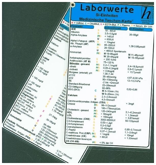 Inhalt Labor Normwerte SI: - Blutwerte - Urinwerte - Glieferung: Parameter / Blut-Entnahmeart / konventionelle Blutwerte / SI-Einheiten - Umrechnungsfaktoren vieler weiterer Parameter Diese Karte zeichnet sich besonders durch eine der umfangreichsten SI-Laborp...