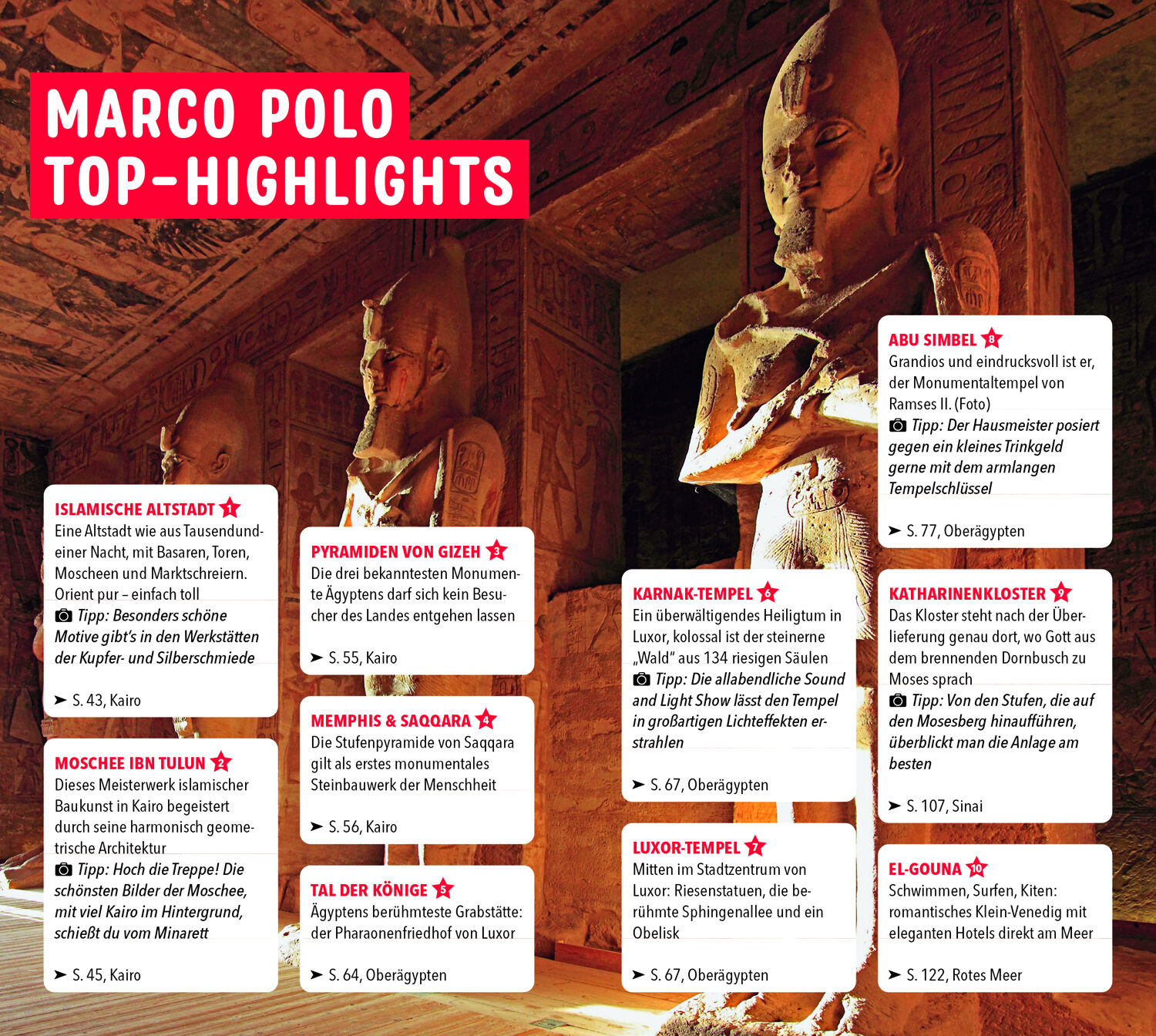 Schau der Sphinx in die Augen, wenn du mit dem MARCO POLO Reiseführer Ägypten erkundest! Heute durch farbenprächtige Korallenriffe tauchen, morgen beim Egyptian Dance Festival Bauchtanzen lernen und am nächsten Tag auf dem Mega-Basar in Kairo nach Souvenirs s...