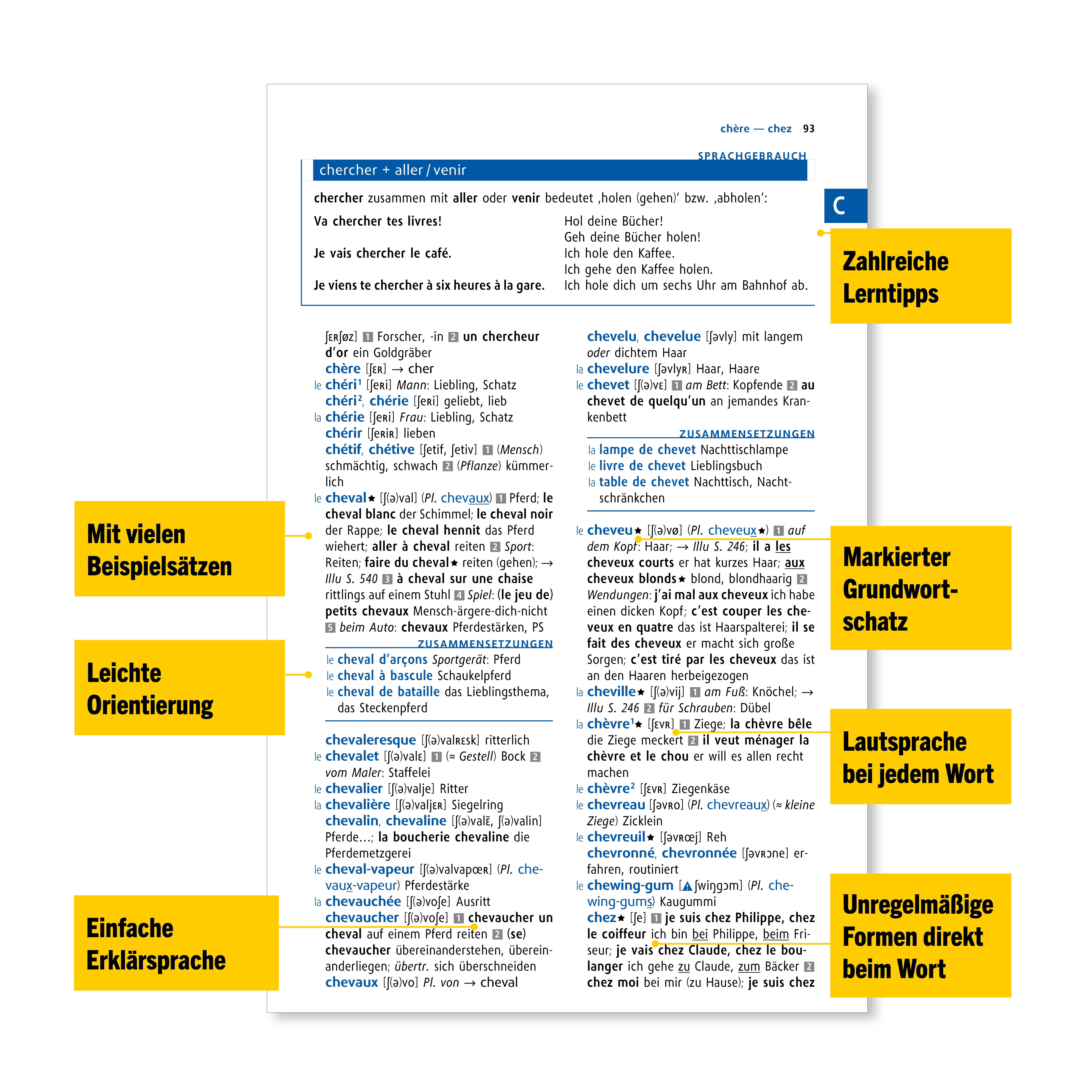 Französisch-Wörterbuch für Schülerinnen und Schüler, sowie erwachsene Lernende an der VHS Enthält rund 65.000 französische Stichwörter und Wendungen Zahlreiche Infofenster zu Grammatik, Wortschatz und Landeskunde 22 farbige Illustrationen zu wichtigen Alltagt...