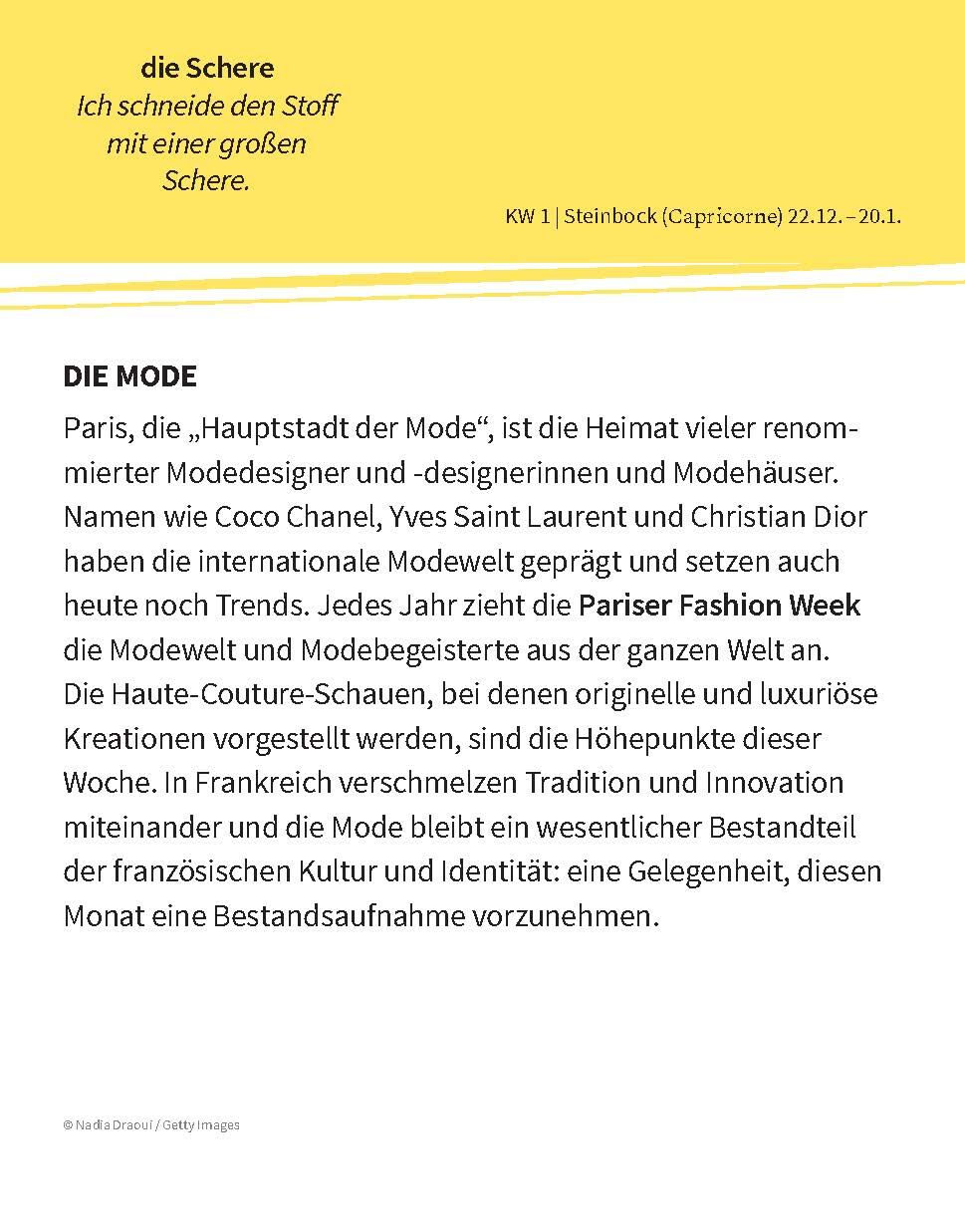 Täglich 5 bis 10 Minuten Lernspaß! Der perfekte Mix aus Sprachtraining, Information und Unterhaltung Jedes Kalenderblatt mit Vokabel des Tages inkl. Übersetzung und Beispielsatz Effektiv lernen, üben und rätseln Wochenrhythmus: Montag: Wissenswertes zu Land &...
