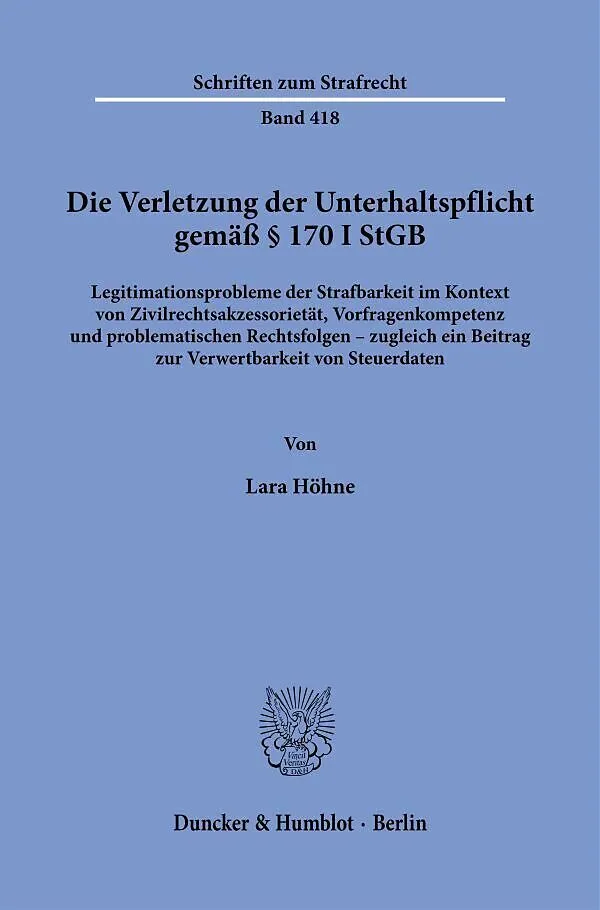 Neben dem von § 170 I StGB zu schützenden Rechtsgut und der damit zusammenhängenden Legitimierbarkeit einer Strafbewehrung befasst sich die Arbeit maßgeblich mit der Bindungswirkung zivilgerichtlicher Status- und Unterhaltsentscheidungen im Strafprozess sowie ...