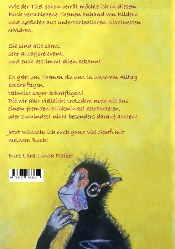Wie der Titel schon verrät, möchte ich in diesem Buch verschiedene Themen anhand von Bildern und Gedichte aus unterschiedlichen Sichtweisen erklären. Sie sind alle samt, sehr alltagsrelevant, und euch bestimmt allen bekannt. Es geht um Themen, die uns in unser...