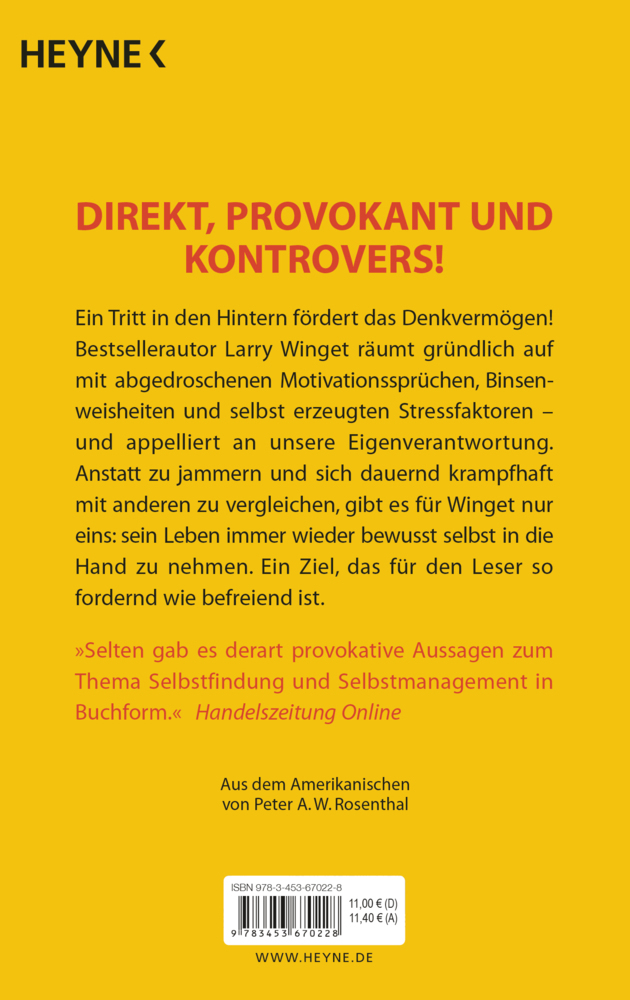 Direkt, provokant und kontrovers! Ein Tritt in den Hintern fördert das Denkvermögen! Bestsellerautor Larry Winget räumt auf mit abgedroschenen Motivationssprüchen, Binsenweisheiten und selbst erzeugten Stressfaktoren und appelliert an unsere Eigenverantwortung...Direkt, provokant und kontrovers!
