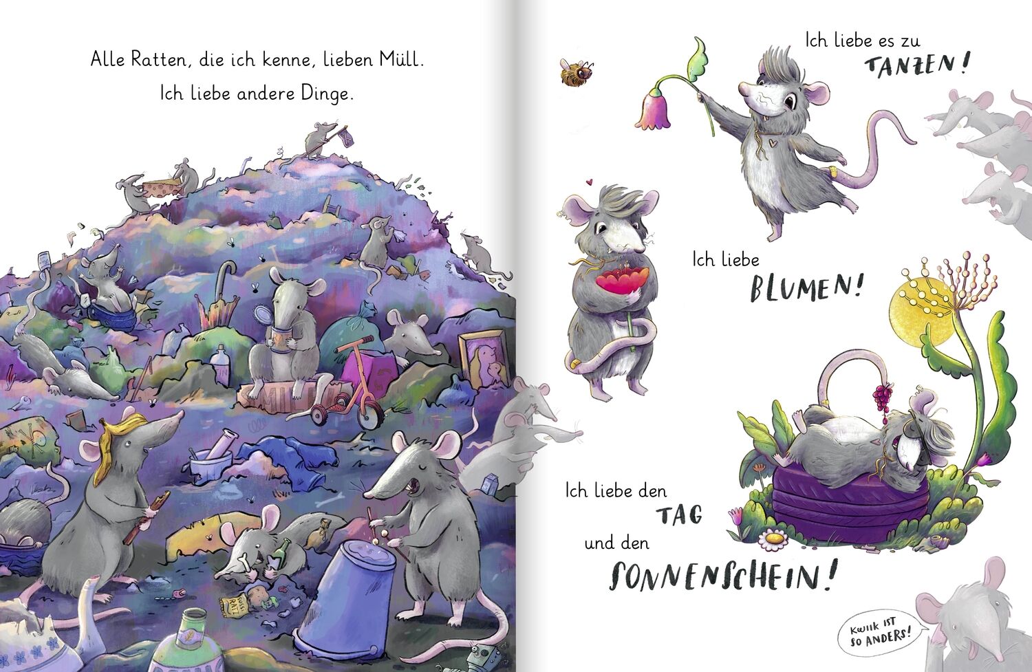 Anders sein ist ganz normal! Die kleine Ratte Kwiik ist anders als andere Ratten. Während die anderen es schmutzig und dunkel mögen und gerne im Müll wühlen, liebt Kwiik die Sonne, das Tanzen und duftende Blumen. Dafür wird Kwiik gerne von den anderen ausgela...