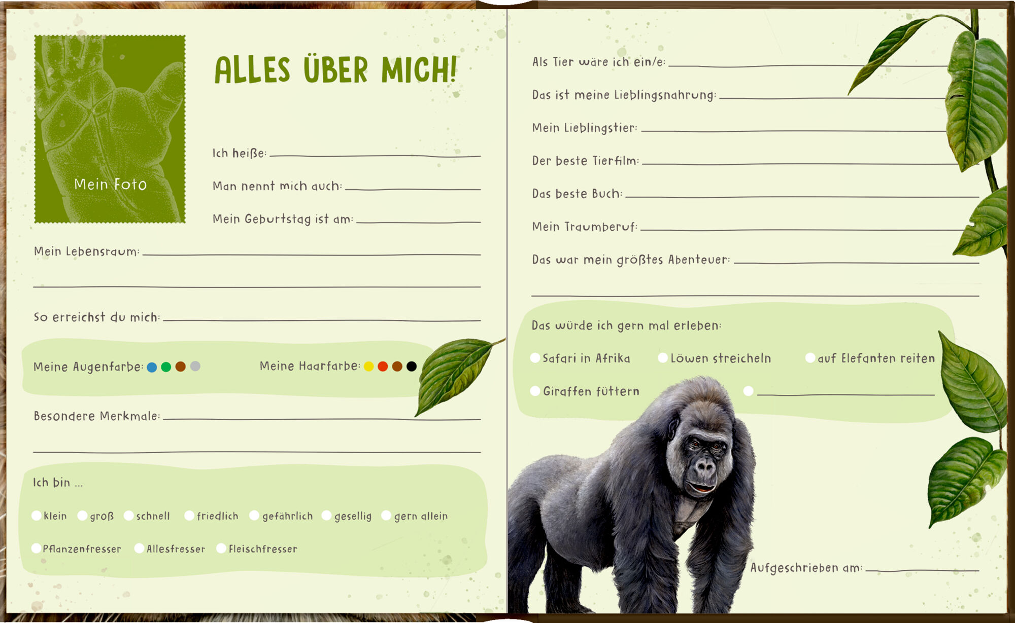 Das Freundebuch mit den schönsten Tieren Afrikas 7 kreative Eintragseiten für deine Freunde Faszinierende Tier-Illustrationen von Löwe, Giraffe, Zebra und Co. Spannende Informationen über die Tiere Afrikas Dieses Freundebuch lädt dich auf eine spannende Safar...