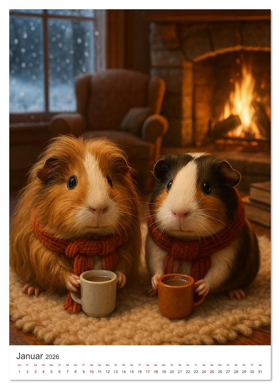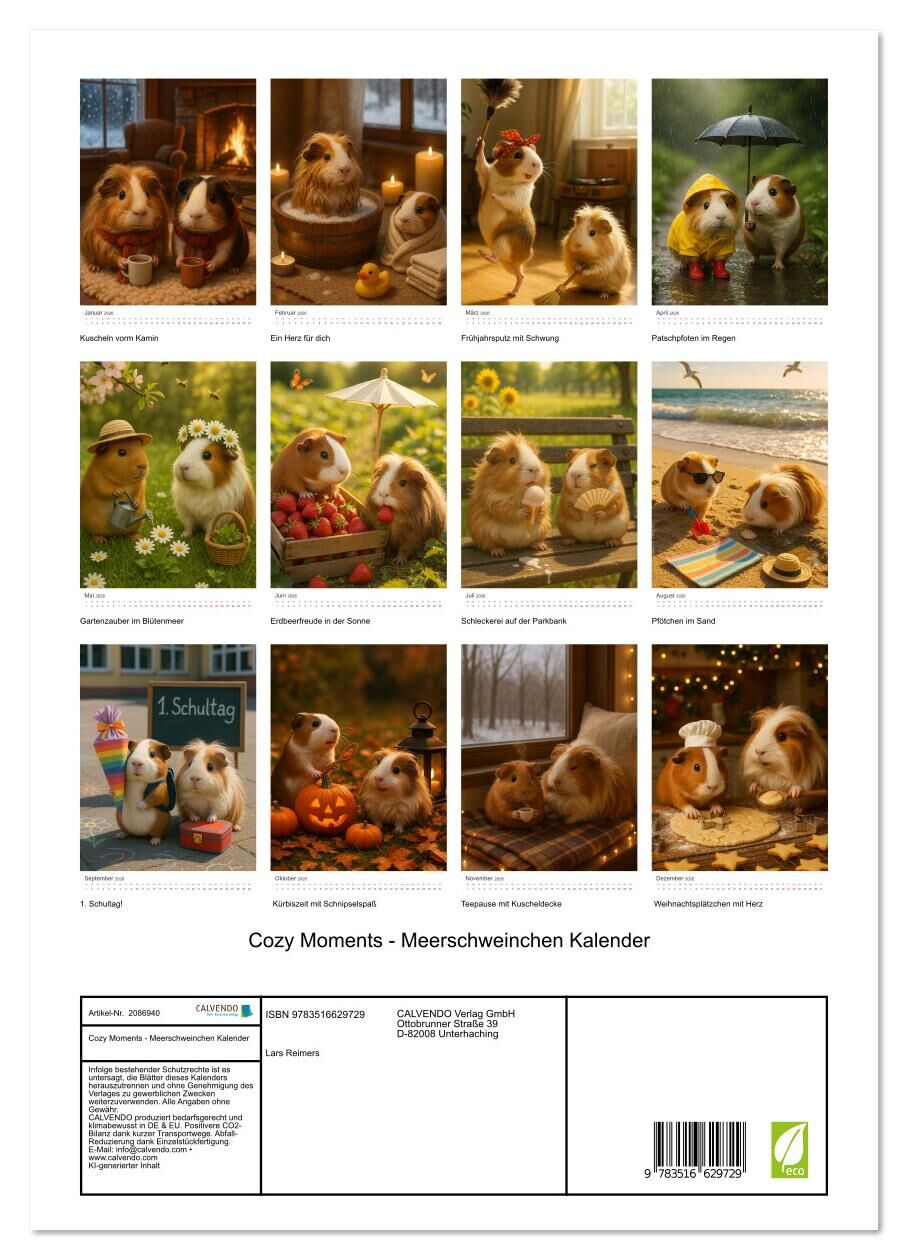 Ein Kalender voller gemütlicher Meerschweinchen-Szenen. Tauche ein in ein Jahr voller flauschiger Freude! Der Kalender begleitet dich Monat für Monat mit liebevoll inszenierten, fotorealistischen Bildern kleiner Fellfreunde in menschlich anmutenden Alltagssitu...