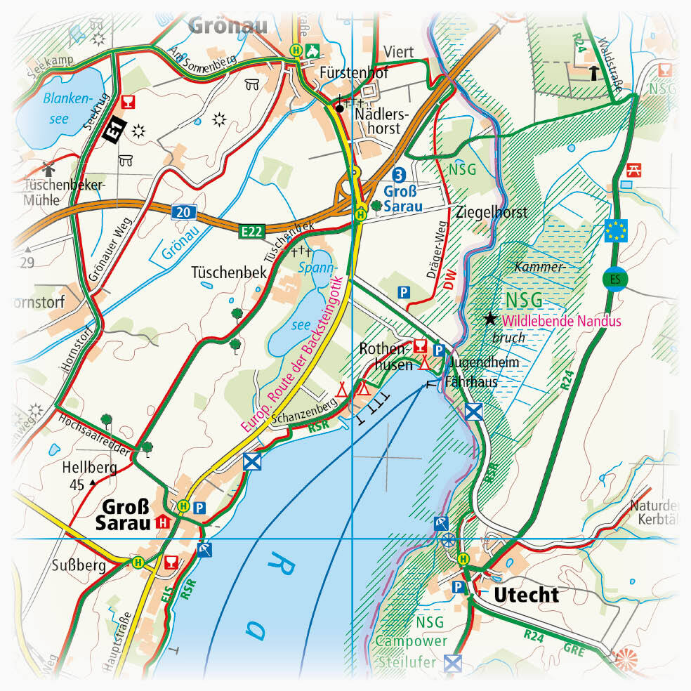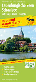 Der Naturpark Lauenburgische Seen mit dem Biosphärenreservat Schaalsee prägt den Kartenausschnitt. Markierte Rad- und Wanderwege führen ufernah um Schaalsee und Ratzeburger See oder entlang des Elbe-Lübeck-Kanals. Weitere Wege durchziehen die hügelige, von Wäl...