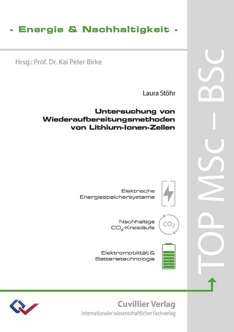 https://cuvillier.de/de/shop/publications/8842-untersuchung-von-wiederaufbereitungsmethoden-von-lithium-ionen-zellen Aufgrund des steigenden Einsatzes regenerativer und somit fluktuierender Energiequellen sind Energiespeicher notwendig. Besonders effizient sin...