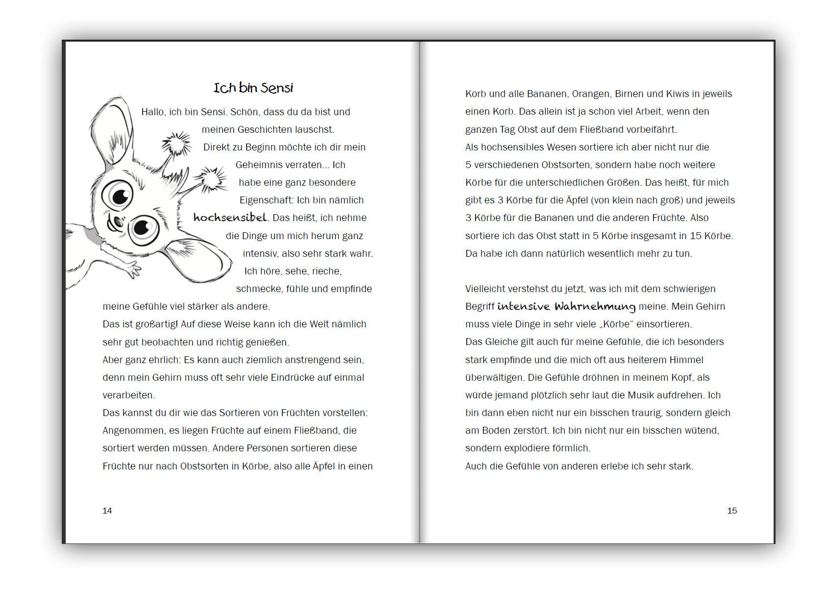 Hallo, ich bin Sensi. Schön, dass du da bist und meinen Geschichten lauschst. Direkt zu Beginn möchte ich dir mein Geheimnis verraten... Ich habe eine ganz besondere Eigenschaft: Ich bin nämlich hochsensibel. Das heißt, ich nehme die Dinge um mich herum ganz intensiv, also sehr stark wahr. Ich höre, sehe, rieche, schmecke, fühle und empfinde meine Gefühle viel stärker als andere. Das ist großartig! Auf diese Weise kann ich die Welt nämlich sehr gut beobachten und richtig genießen. Aber ganz ehrlich: Es kann auch ziemlich anstrengend sein, denn mein Gehirn muss oft sehr viele Eindrücke auf einmal verarbeiten.
