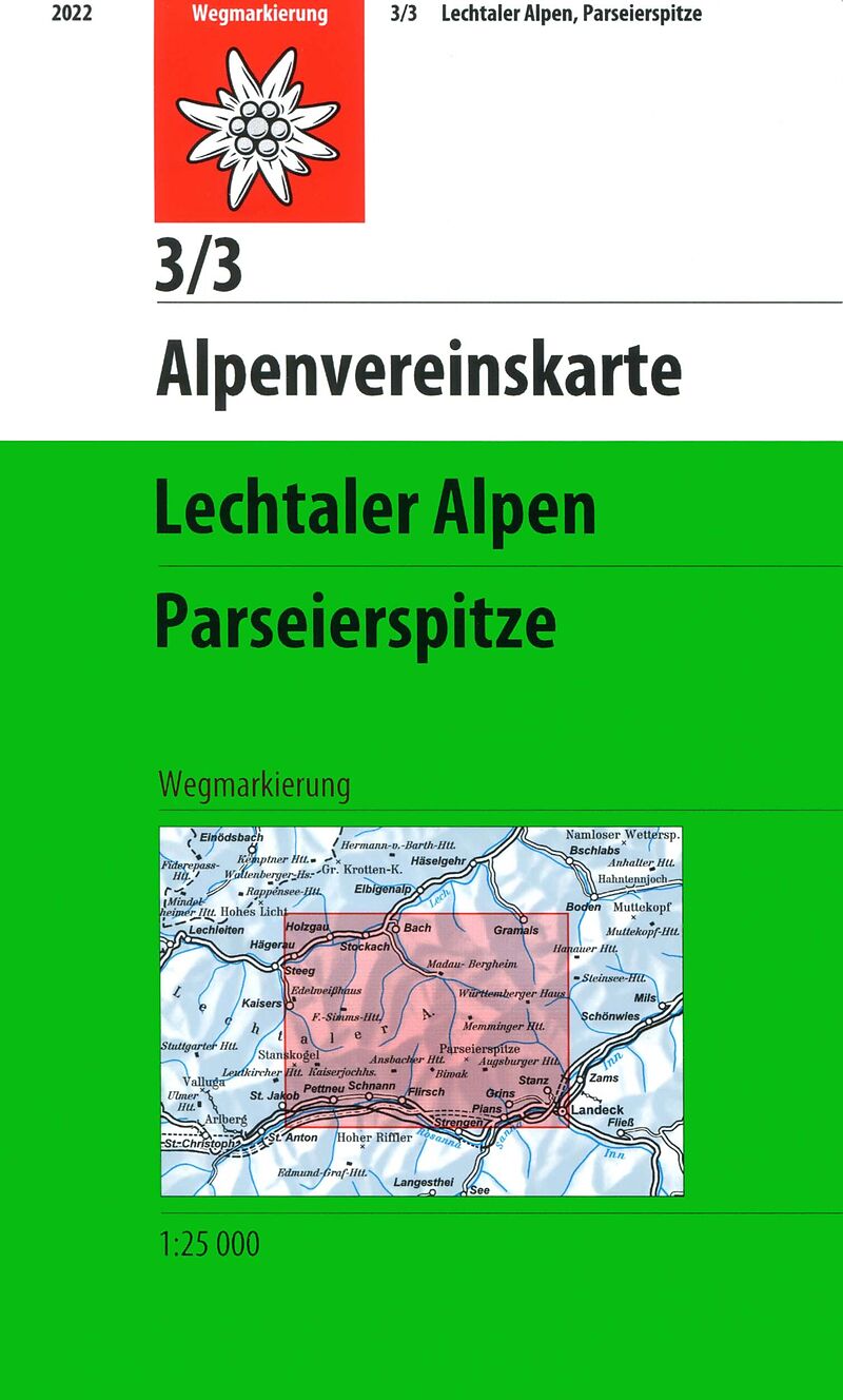 Topographische Karte 1:25.000, mehrfarbig, mit Wegmarkierungen, Bushaltestellen, Schummerung, Felszeichnung, Gletscherdarstellung, Kennzeichnung der Klettersteige, UTM-Gitter. Gebiet: Lechtaler Alpen zwischen Holzgau und Landeck, mit der Parseierspitze und der...