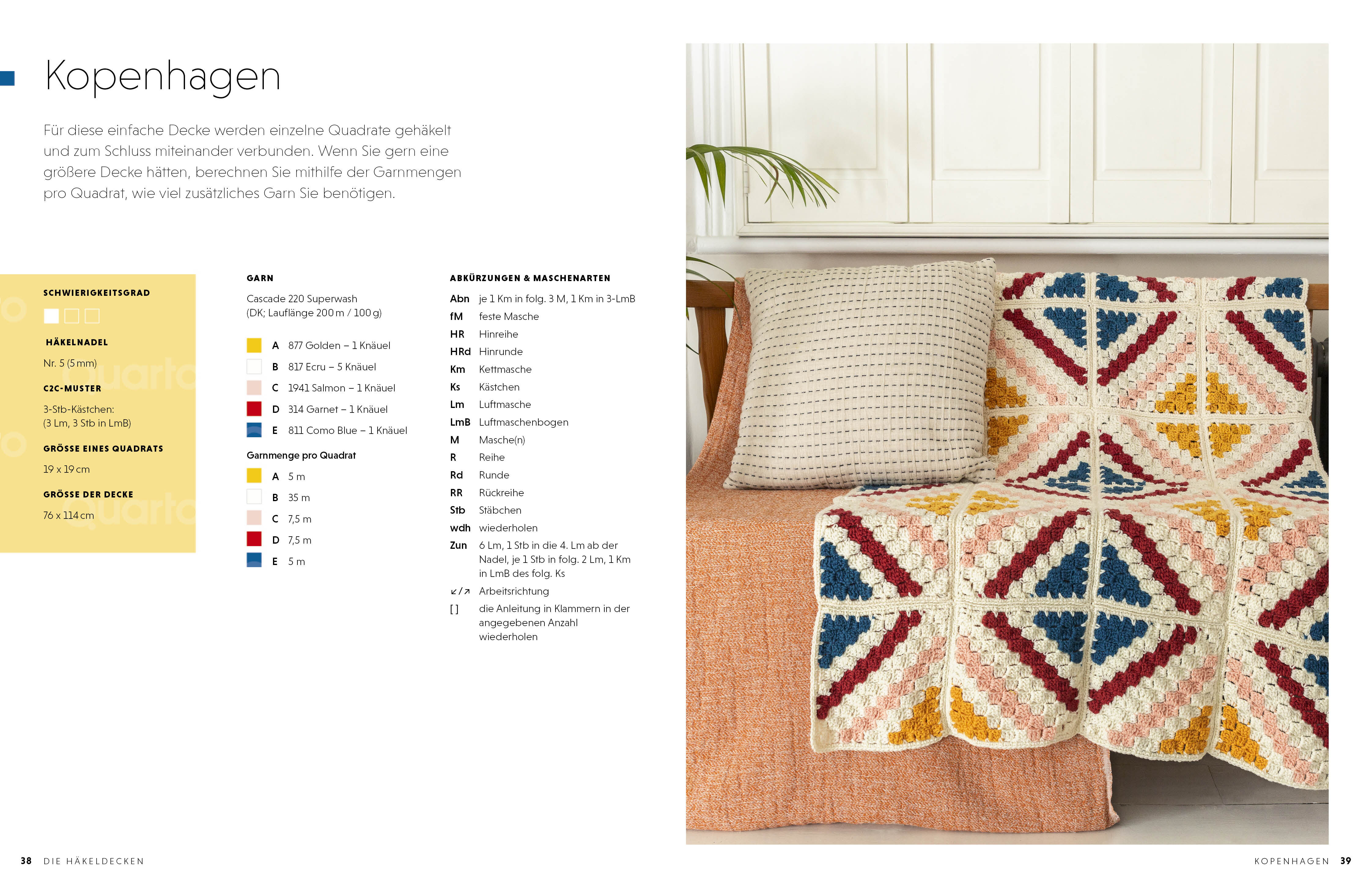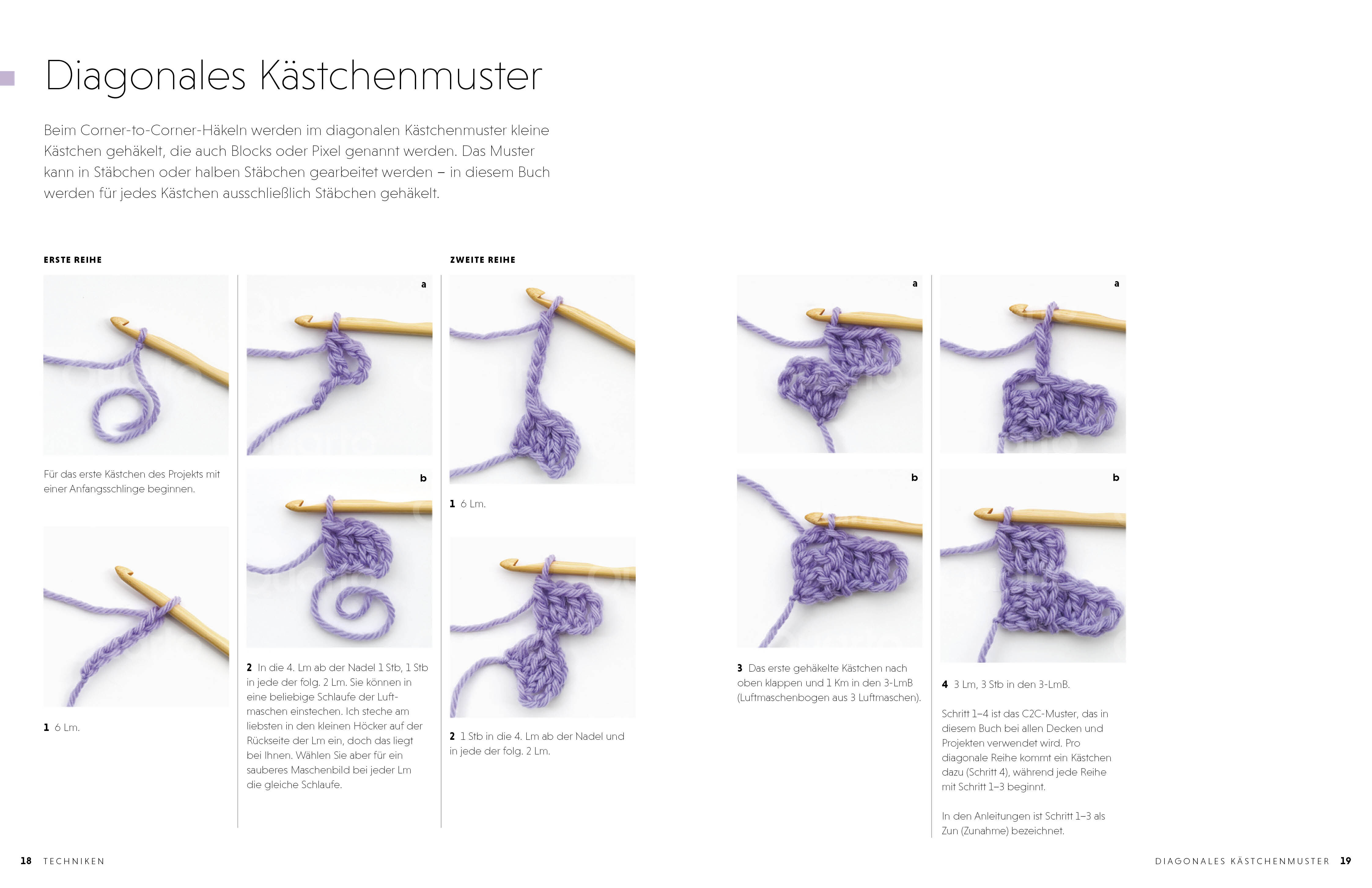 Die Corner-to-Corner-Technik ist ideal, wenn du Decken, Kissen, Überwürfe und mehr unkompliziert in einem Stück häkeln möchtest . Wie der Name schon sagt, häkelst du von Ecke zu Ecke. Geometrische Häkelmuster und Jacquard-Techniken werden innovativ kombiniert, um moderne C2C-Decken und Häkelaccessoires herzustellen. Egal ob du ein Fan von modernen Häkeldecken oder klassischen Granny Squares bist die vielseitigen Häkelmuster bieten für jeden Geschmack etwas.