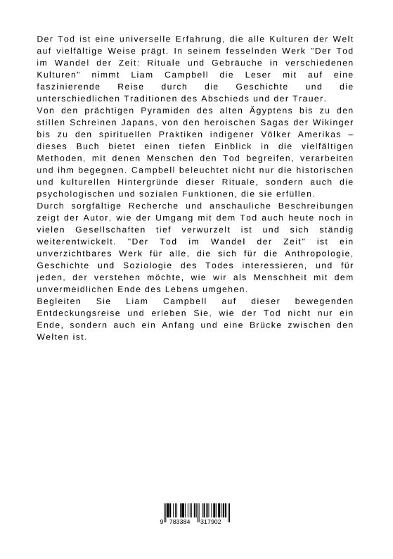 Der Tod ist eine universelle Erfahrung, die alle Kulturen der Welt auf vielfältige Weise prägt. In seinem fesselnden Werk "Der Tod im Wandel der Zeit: Rituale und Gebräuche in verschiedenen Kulturen" nimmt Liam Campbell die Leser mit auf eine faszinierende Rei...