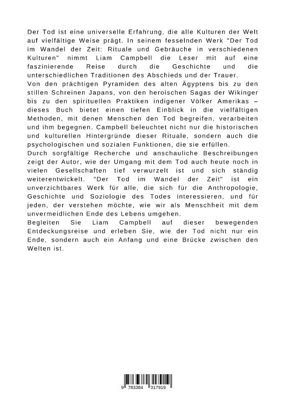 Der Tod ist eine universelle Erfahrung, die alle Kulturen der Welt auf vielfältige Weise prägt. In seinem fesselnden Werk "Der Tod im Wandel der Zeit: Rituale und Gebräuche in verschiedenen Kulturen" nimmt Liam Campbell die Leser mit auf eine faszinierende Rei...