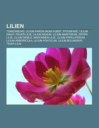Quelle: Wikipedia. Seiten: 78. Kapitel: Türkenbund, Lilium pardalinum subsp. pitkinense, Lilium grayi, Feuer-Lilie, Lilium nanum, Lilium maritimum, Oster-Lilie, Lilium debile, Madonnen-Lilie, Lilium papilliferum, Lilium arboricola, Lilium ponticum, Lilium bola...Quelle: Wikipedia. Seiten: 78. Kapitel: Türkenbund, Lilium pardalinum subsp. pitkinense, Lilium grayi, Feuer-Lilie, Lilium nanum, Lilium maritimum, Oster-Lilie, Lilium debile, Madonnen-Lilie, Lilium papilliferum, Lilium arboricola, Lilium ponticum, Lilium bolanderi, Tiger-Lilie, Krainer Lilie, Lilium distichum, Lilium formosanum, Lilium amabile, Lilium concolor, Philippinen-Lilie, Lilium nobilissimum, Panther-Lilie, Lilium eupetes, Lilium sherriffiae, Lilium rubellum, Pracht-Lilie, Lilium pyrophilum, Kanada-Lilie, Lilium ciliatum, Lilium catesbaei, Henrys Lilie, Königs-Lilie, Lilium bakerianum, Lilium primulinum, Lilium nepalense, Lilium pinifolium, Davids-Lilie, Lilium puerense, Lilium medeoloides, Lilium taliense, Chalzedonische Lilie, Lilium wallichianum, Lilium michauxii, Lilium philadelphicum, Lilium amoenum, Lilium medogense, Lilium sempervivoideum, Lilium floridum, Lilium washingtonianum, Lilium parryi, Lilium rubescens, Lilium superbum, Lilium sulphureum, Lilium duchartrei, Lilium michiganense, Lilium pensylvanicum, Lilium pyi, Seealpen-Lilie, Lilium kelleyanum, Lilium henrici, Lilium szovitsianum, Lilium habaense, Lilium lankongense, Lilium maculatum var. bukosanense, Lilium sargentiae, Lilium lijiangense, Lilium humboldtii, Lilium columbianum, Lilium huidongense, Lilium fargesii, Krim-Lilie, Lilium ledebourii, Lilium occidentale, Pyrenäen-Lilie, Lilium pumilum, Lilium brownii, Lilium stewartianum, Rhodopen-Lilie, Lilium auratum, Lilium callosum, Lilium nanum var. flavidum, Lilium lophophorum, Lilium wallichianum var. neilgherrense, Lilium primulinum var. ochraceum, Lilium cernuum, Lilium souliei, Lilium rosthornii, Lilium kelloggii, Lilium mackliniae, Lilium parvum, Lilium leucanthum, Lilium xanthellum, Lilium brevistylum, Lilium wenshanense, Lilium wardii, Lilium iridollae, Lilium polyphyllum, Lilium anhuiense, Lilium paradoxum, Lilium matangense, Lilium jinfushanense, Lilium bosniacum, Lilium hansonii, Lilium akkusianum, Lilium saccatum, Lilium platyphyllum, Lilium japonicum, Lilium tsingtauense, Lilium kesselringianum, Lilium oxypetalum, Lilium tianschanicum, Lilium martagon var. cattaniae, Lilium jankae, Lilium leichtlinii, Lilium albanicum, Lilium poilanei, Agnes Bernauer, Adonis. Auszug: Die Lilien (Lilium) bilden eine Gattung der Familie der Liliengewächse (Liliaceae) innerhalb der einkeimblättrigen Pflanzen mit rund 120 Arten. Ihre Hauptverbreitungsgebiete sind China und Nordamerika, einige wenige Arten finden sich auch in Europa. Lilien wurden aufgrund ihres auffälligen Erscheinungsbilds in vielen Kulturen geschätzt. Einige Arten zählen zu den ältesten Zierpflanzen überhaupt und wurden zu kulturellen Symbolen, insbesondere in Asien finden sie bis heute auch Verwendung als Lebensmittel, seltener ist ein Gebrauch als Heilpflanze. Lilium xanthellum, ZwiebelAlle Lilien sind ausdauernde, krautige Pflanzen, die aus Zwiebeln wachsen und artabhängig eine Höhe von bis zu 310 Zentimeter erreichen. Lilien-Zwiebeln sind meist eiförmig bis annähernd rund, aus zahlreichen Zwiebelschuppen zusammengesetzt und nicht durch eine zusätzliche Außenhaut geschützt. Die unregelmäßig klobig geformten Zwiebeln sind 1,4 bis 11,7 Zentimeter lang und 1,3 bis 19 Zentimeter breit, das Verhältnis von Höhe zu Länge schwankt zwischen 0,1 bis 3 zu 1. Die Zwiebel kann leicht geneigt im Boden liegen und annähernd rhizomatisch mehr oder weniger verlängert, aber auch deutlich ausgeprägt rhizomatisch horizontal verlängert sein, Rhizome wachsen gelegentlich ...