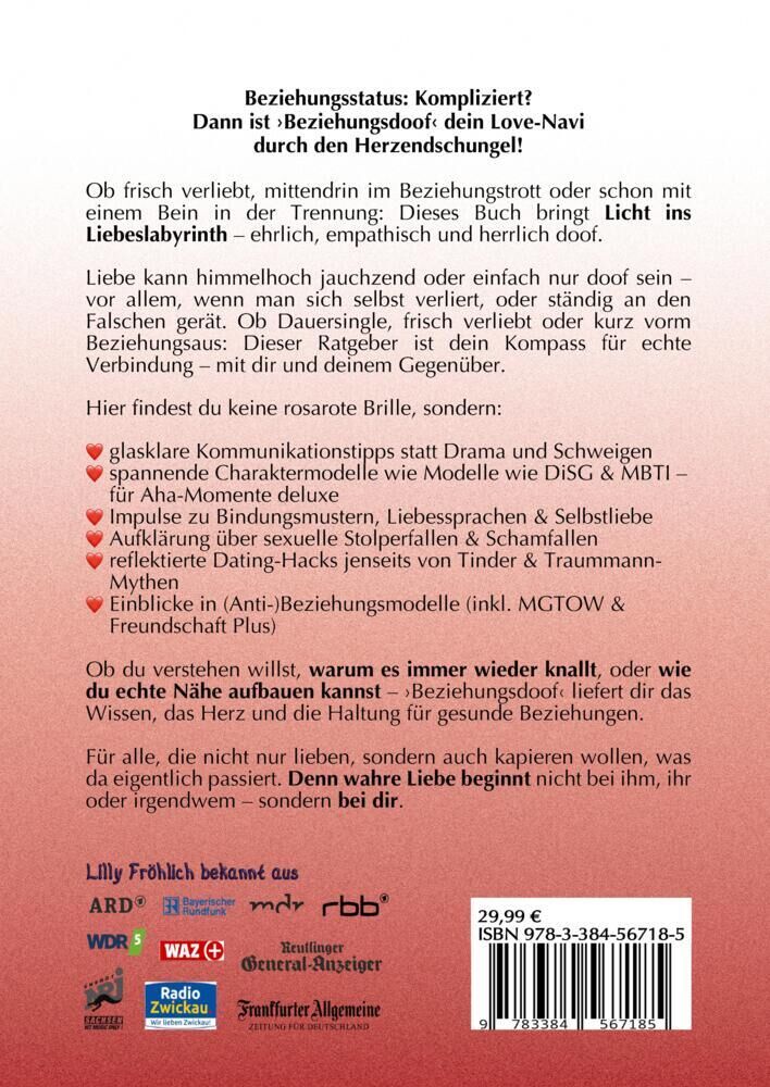 Beziehungsstatus: Kompliziert? Dann ist Beziehungsdoof dein Love-Navi durch den Herzendschungel! Ob frisch verliebt, mittendrin im Beziehungstrott oder schon mit einem Bein in der Trennung: Dieses Buch bringt Licht ins Liebeslabyrinth ehrlich, empathisch und h...