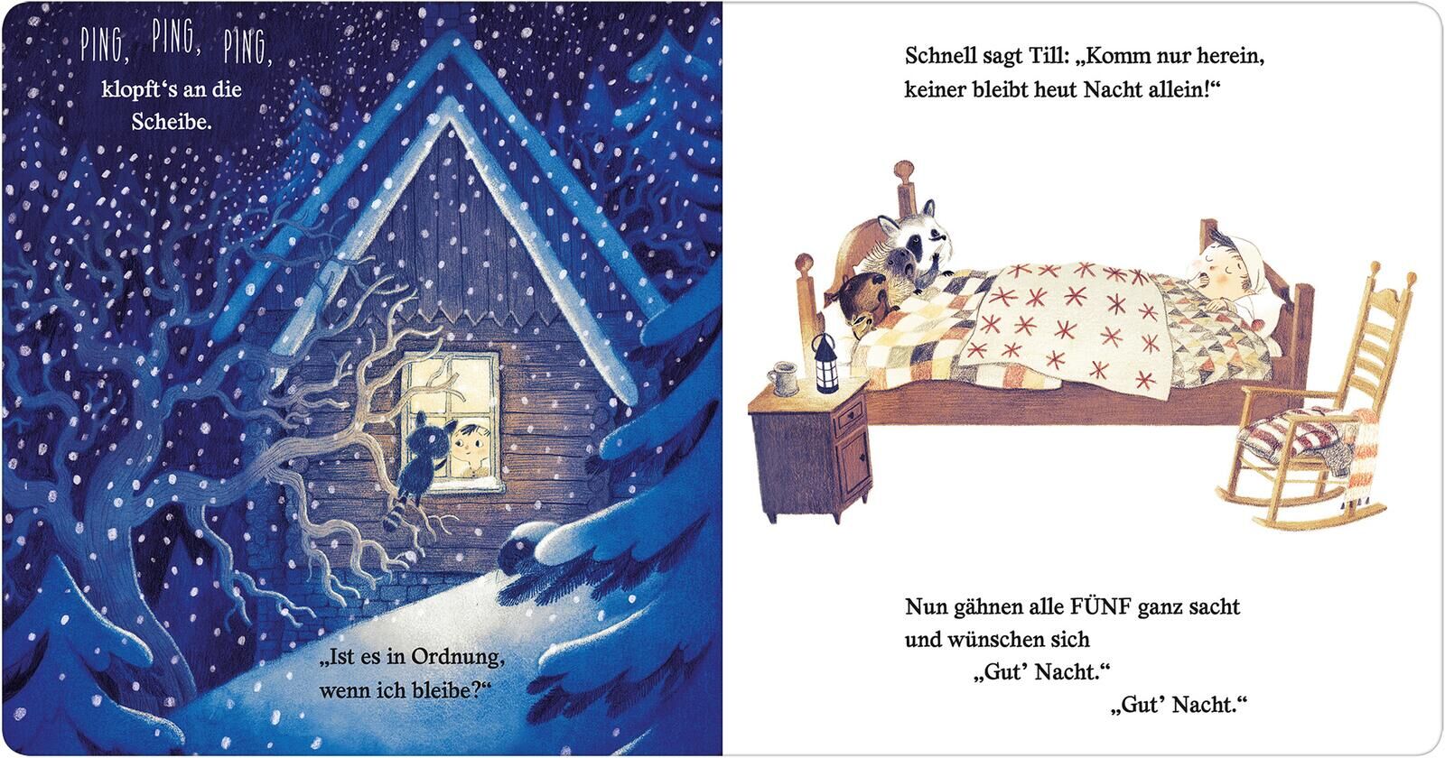 Zum Vorlesen und Kuscheln Auf der Suche nach einem warmen Unterschlupf klopft ein Tier nach dem andere an Tills Tür. Und der kleine Junge mit dem großen Herzen hat für alle einen Platz! Doch schließlich ist sein Bett voll und ein weiterer Gast kündigt sich an...
