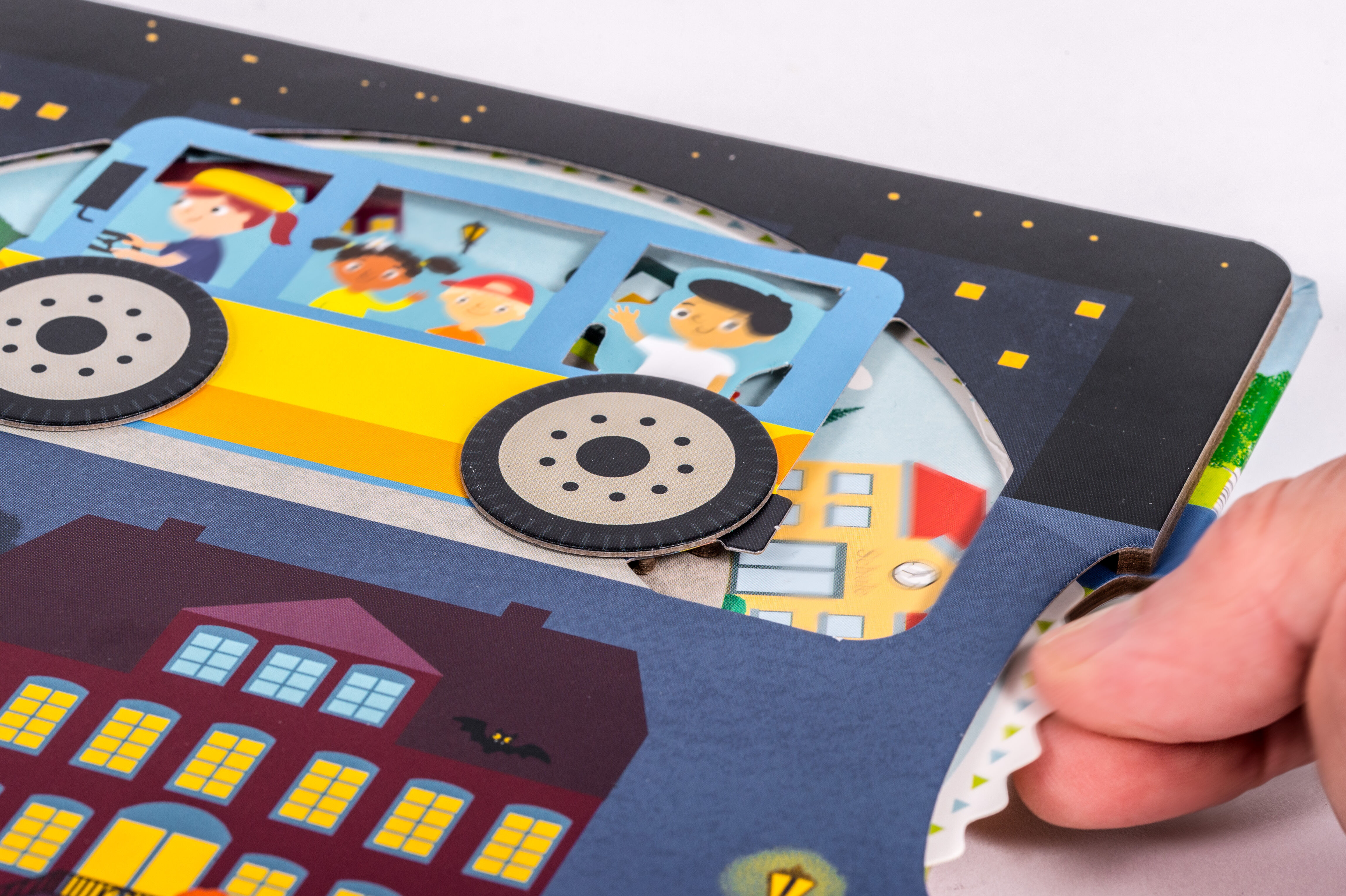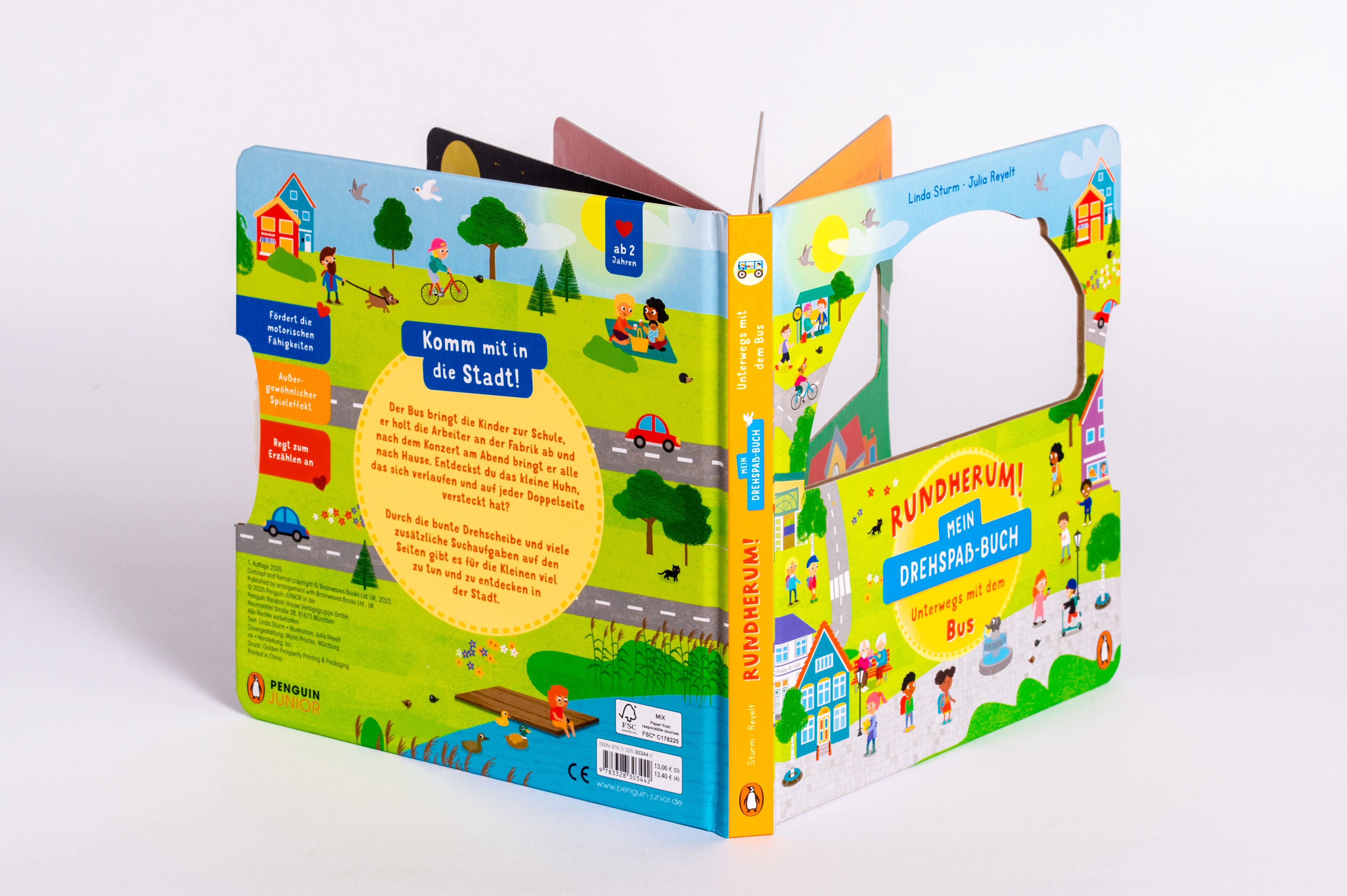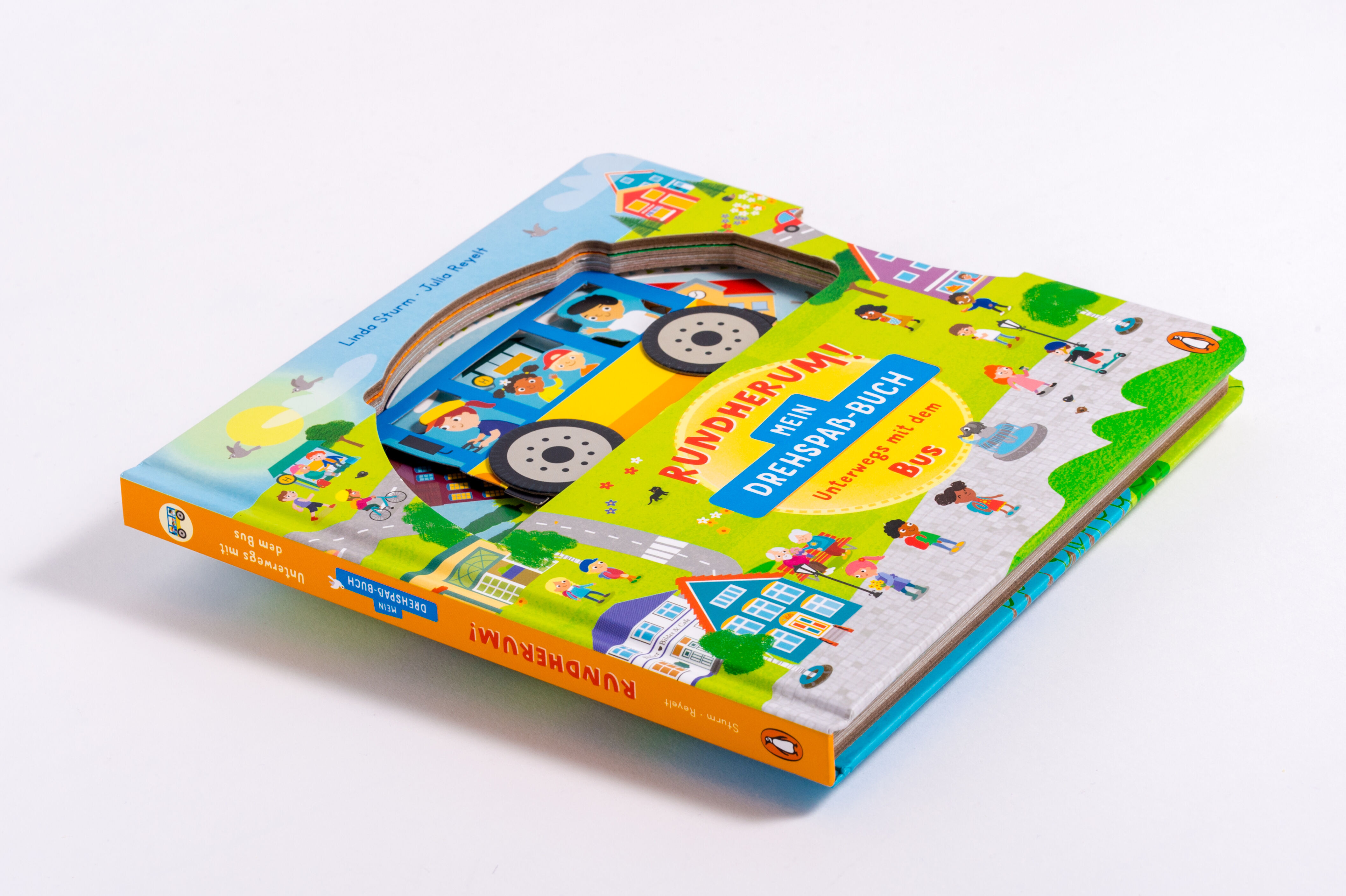 Rundherum! Mein Drehspaß-Buch - Unterwegs mit dem Bus Komm mit in die Stadt! Der Bus bringt die Kinder zur Schule, er holt die Arbeiter an der Fabrik ab und nach dem Konzert am Abend bringt er alle nach Hause. Durch die bunte Drehscheibe und viele Suchaufgaben...