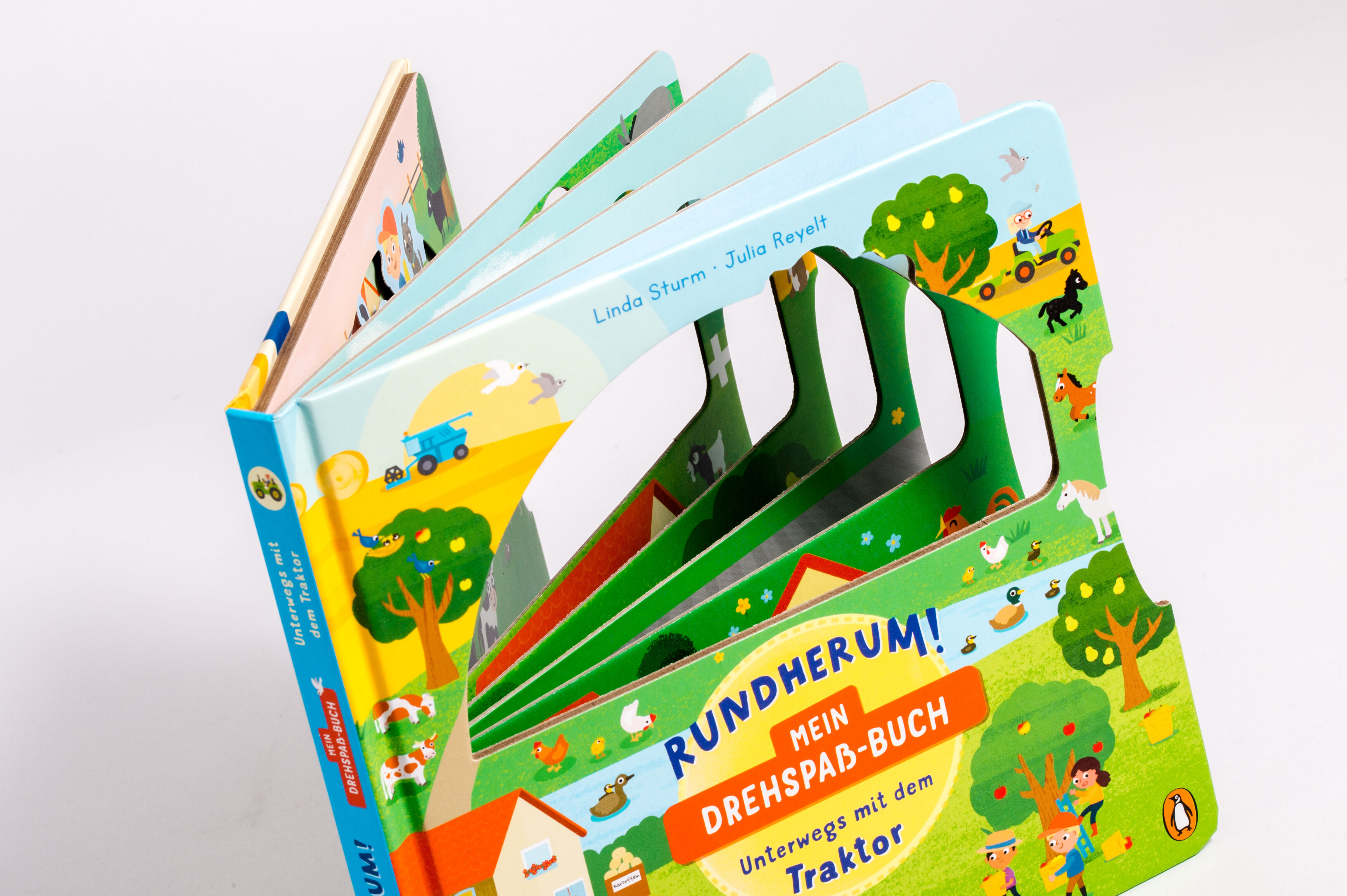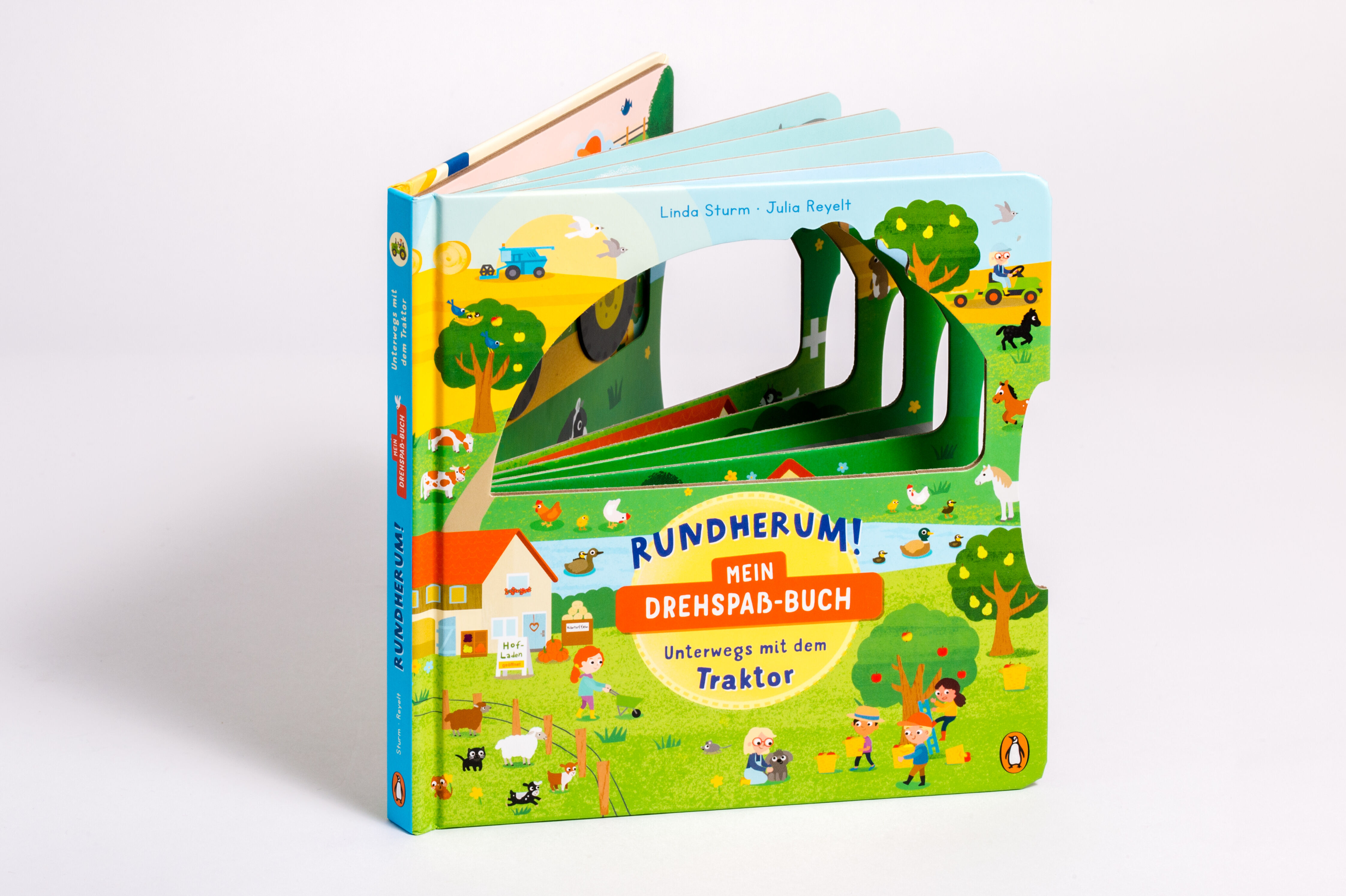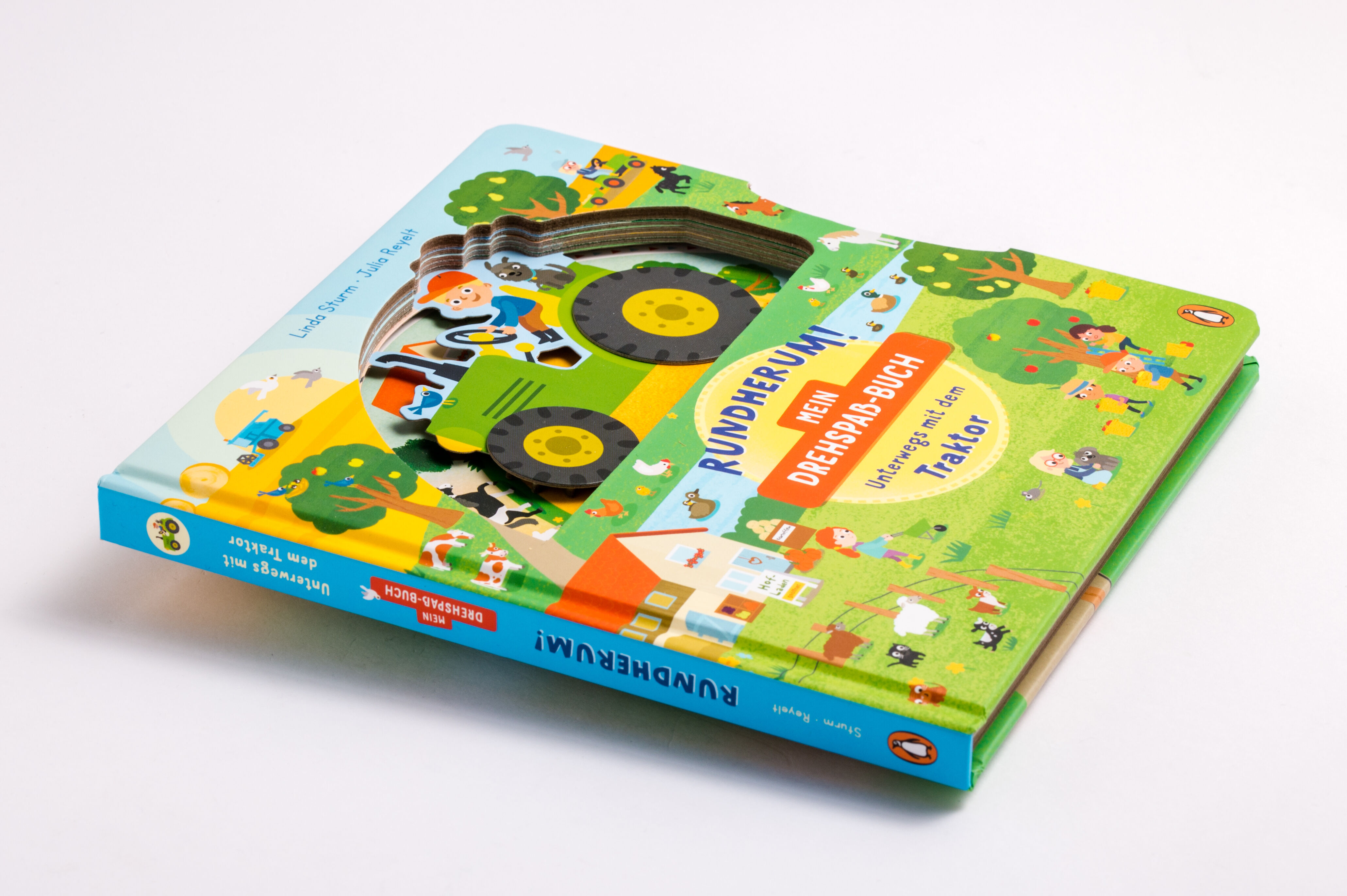 Rundherum! Mein Drehspaß-Buch - Unterwegs mit dem Traktor Mach mit auf dem Bauernhof! Der Traktor bringt frisches Stroh zum Kuhstall, fährt die geernteten Äpfel zum Hofladen und schaut nach den Tieren auf den Weiden. Durch die bunte Drehscheibe und viele Sucha...