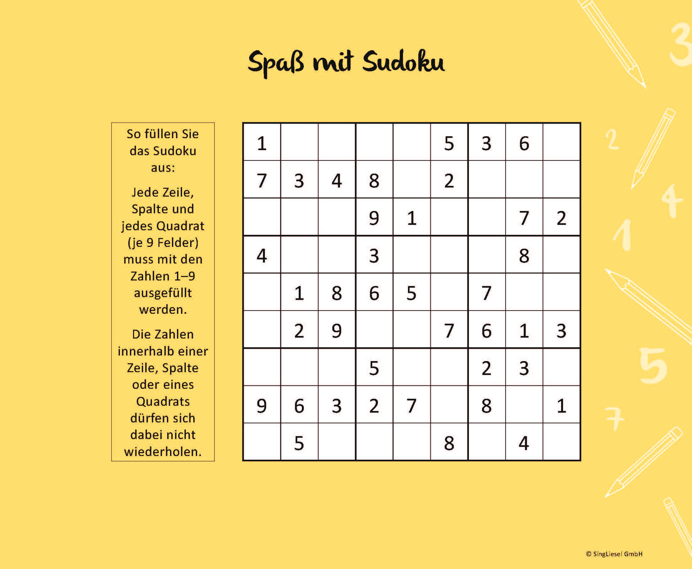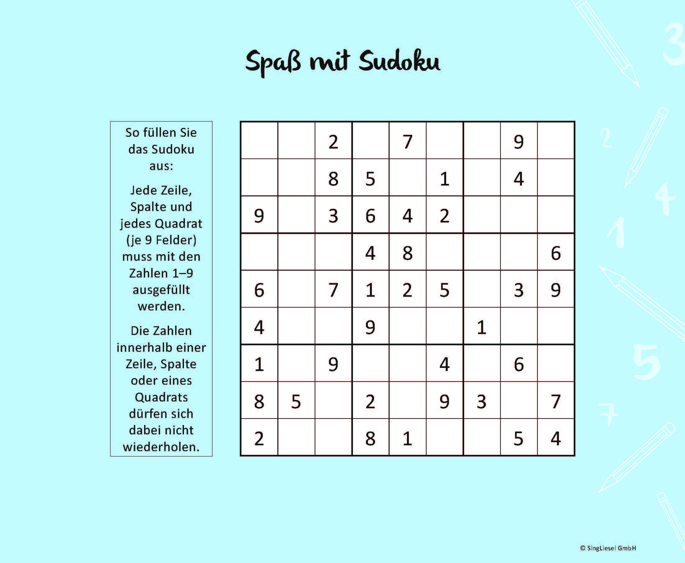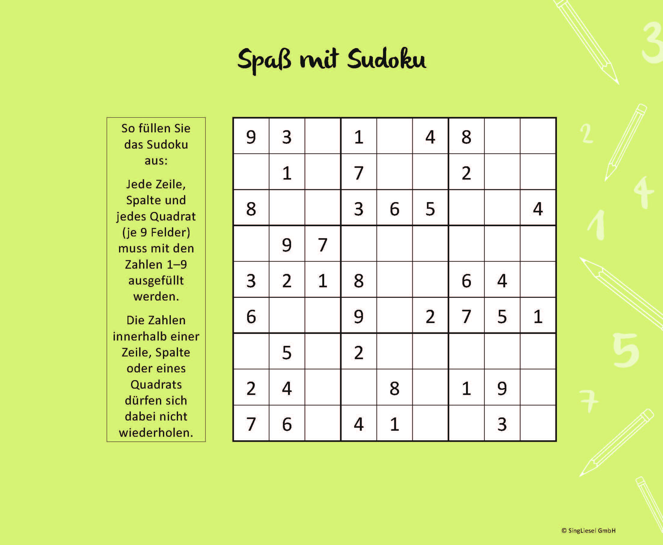 Sudokus für Senioren Sudoku ist ein Zahlenpuzzle-Spiel, das in keiner Rätselsammlung fehlen darf! Die SingLiesel-Sudokus sind dabei etwas ganz Besonderes. Denn sie sind knifflig und doch schnell lösbar. Dadurch eignen sie sich hervorragend für einen leichten E...