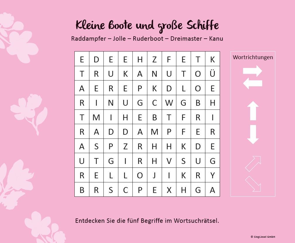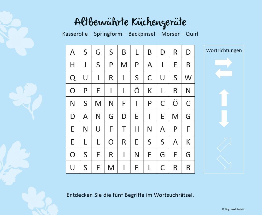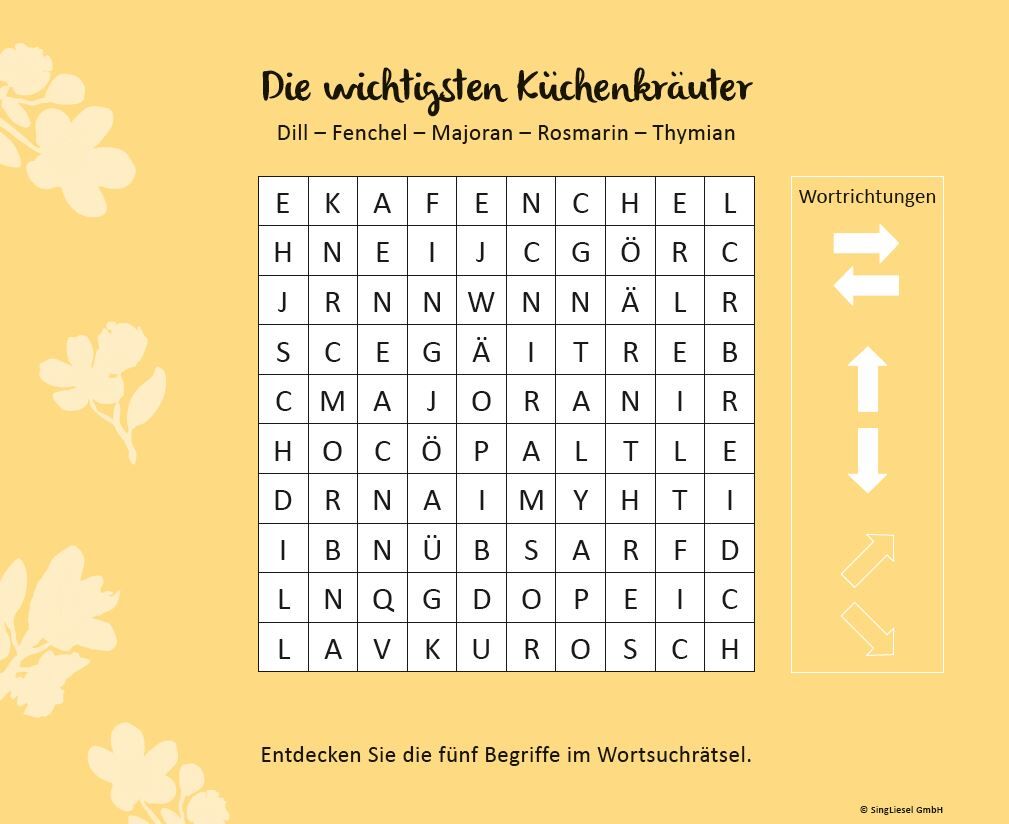 Wortsuchrätsel für Senioren mit vertrauten Begriffen Finden Sie die vertrauten Begriffe im Buchstabensalat! Wortsuchrätsel sind ein beliebter Zeitvertreib und in jedem Rätselheft zu finden. Die SingLiesel-Suchsel machen dabei besonders Spaß. Denn hier dreht si...