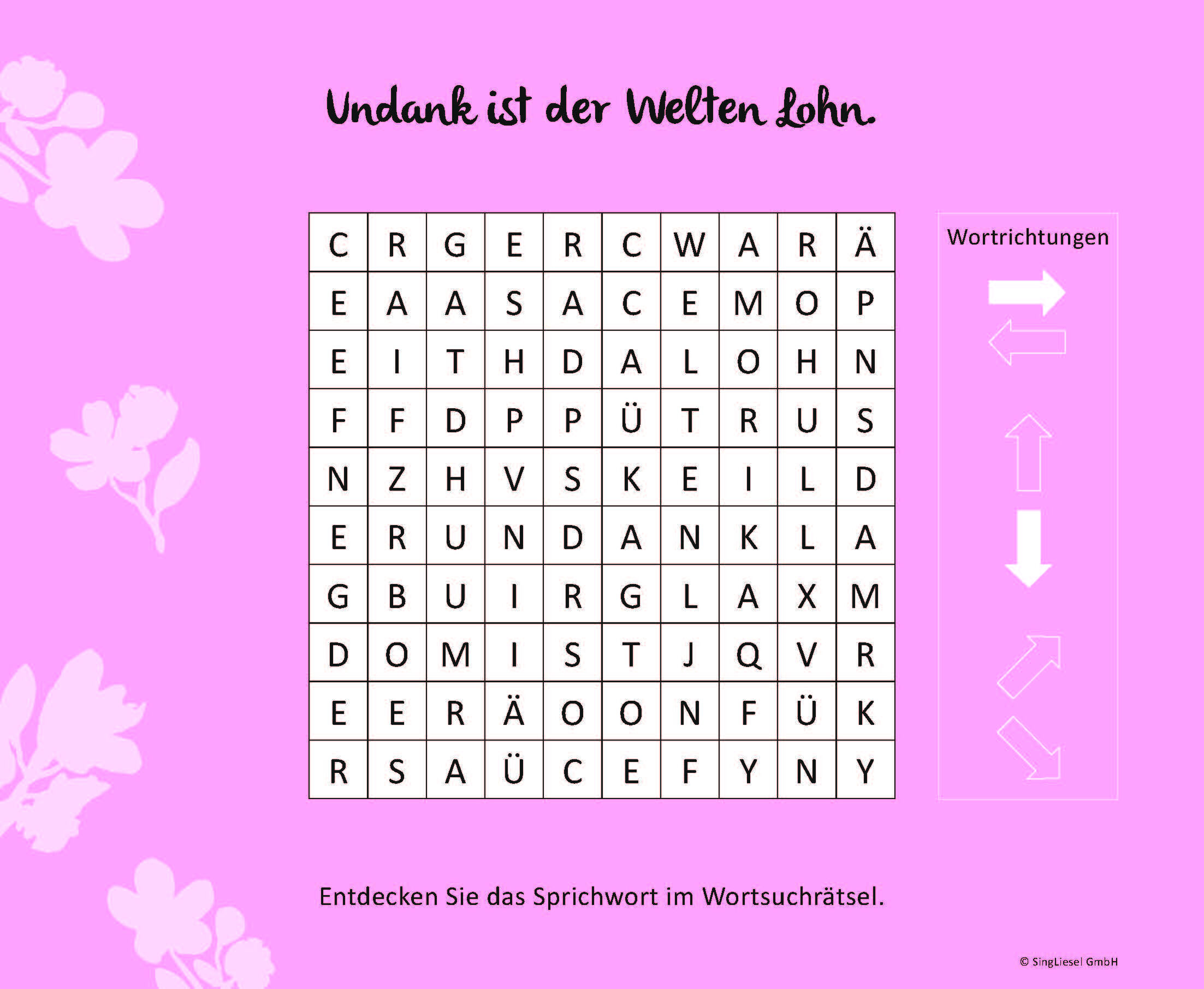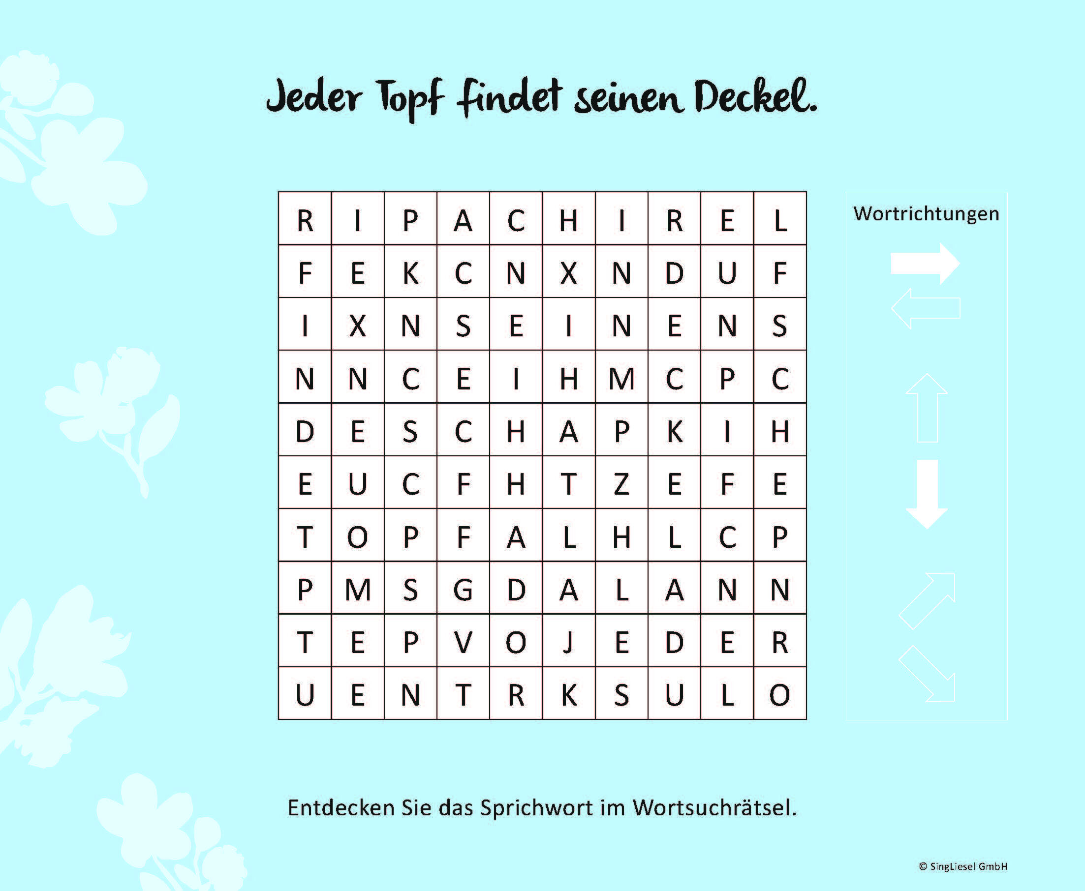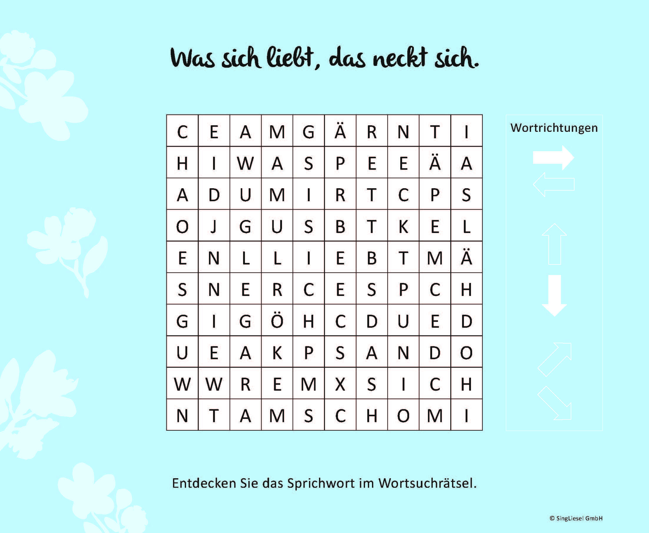 Wortsuchrätsel für Senioren mit vertrauten Sprichwörtern Wortsuchrätsel sind ein beliebter Zeitvertreib und in jedem Rätselheft zu finden. Die SingLiesel-Suchsel sind dabei besonders originell. Denn hier dreht sich alles um bekannte und vertraute Sprichwörter....