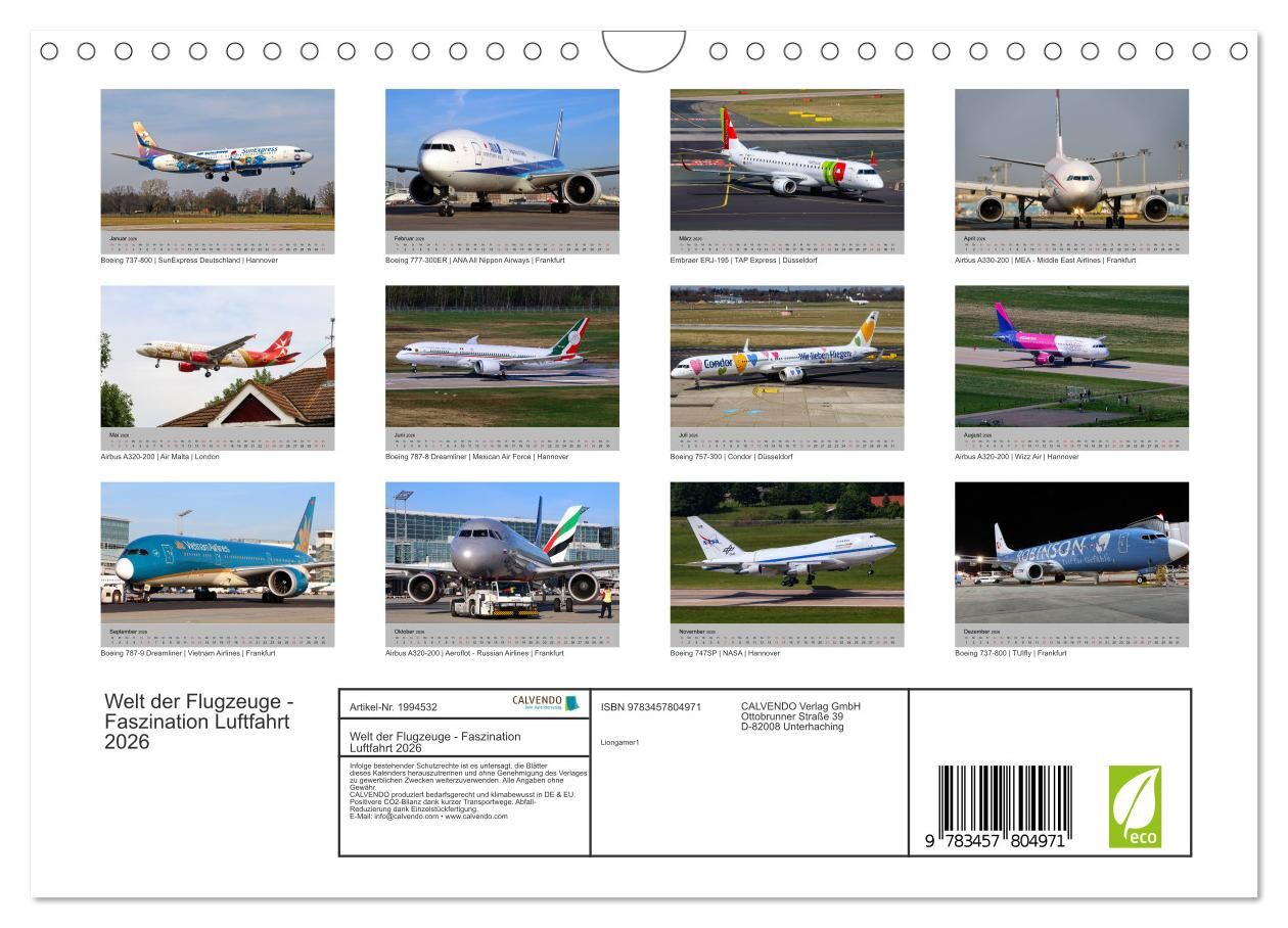 Diesen Kalender möchte kein Flugzeug-Fan missen. Die 12 hochwertigen Farbfotos, die viele unterschiedliche Flugzeugtypen, verschiedener Hersteller, zeigen, wurden größtenteils hautnah an den Flugzeugen, auf dem Vorfeld, aufgenommen.
