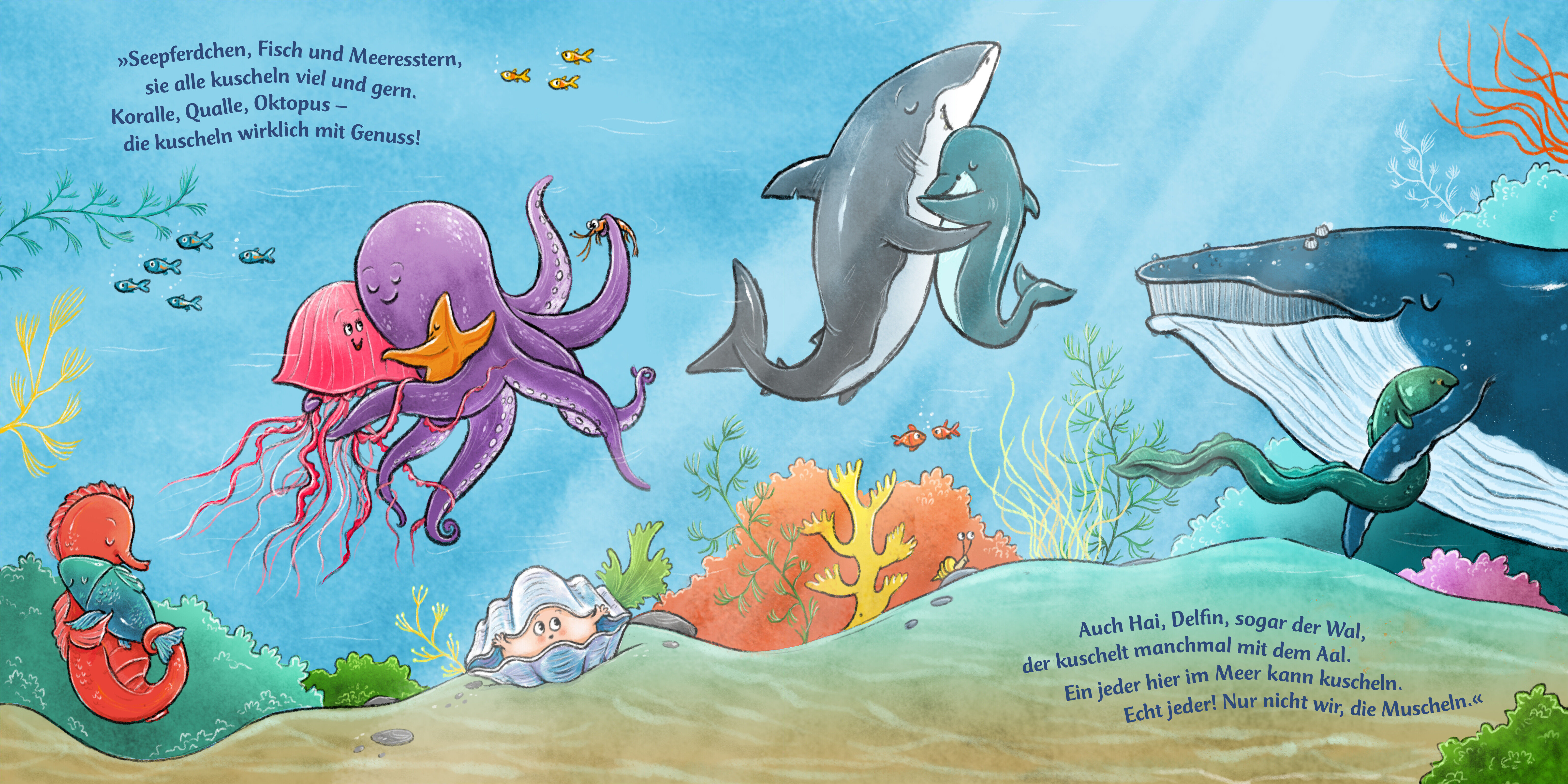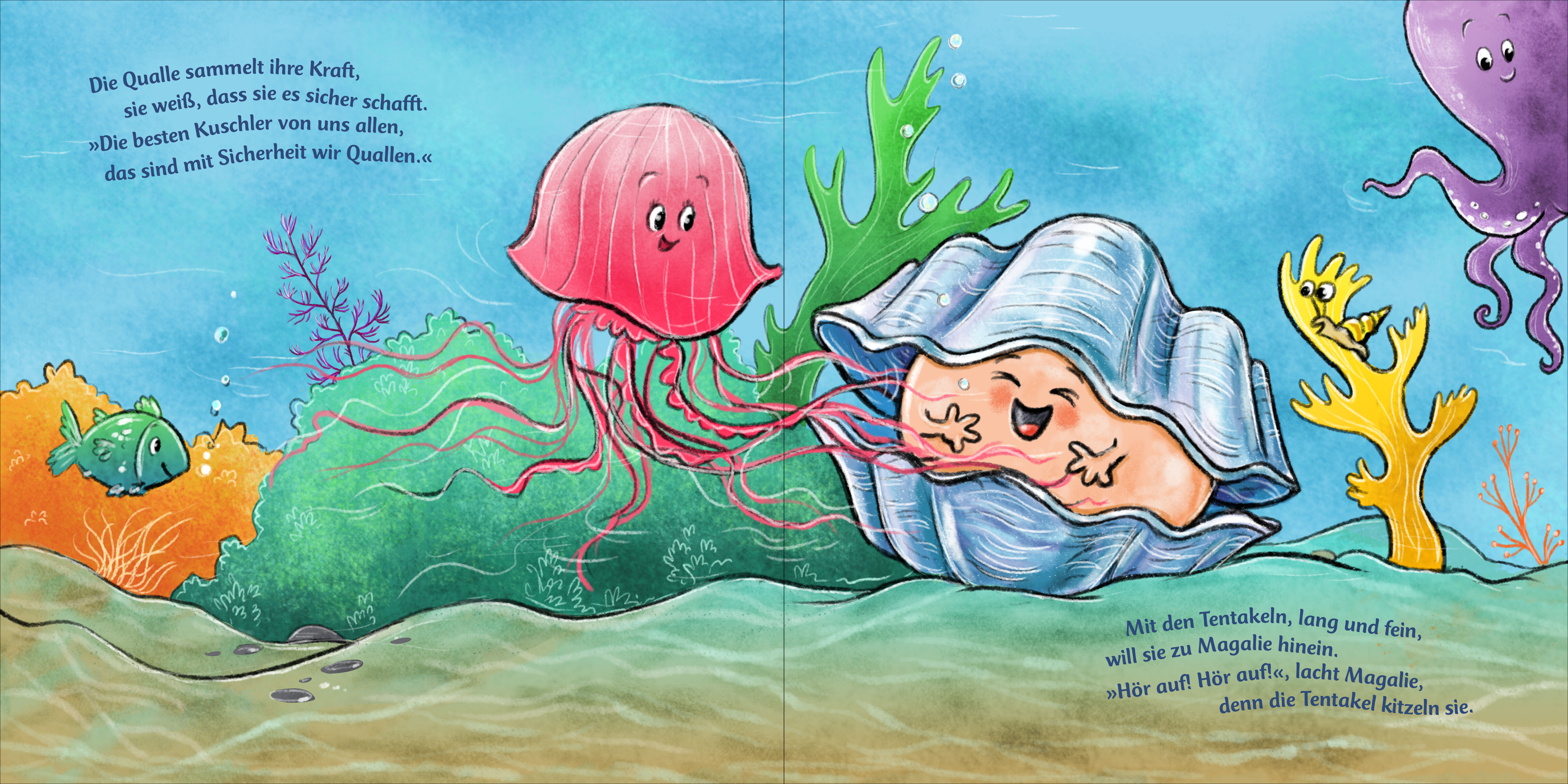 Kuschelalarm im Meer: Magali möchte in den Arm genommen werden! Sie würde so gerne kuscheln aber ihre harte Schale macht das schwierig: Muschel Magalie ist ganz betrübt, weil sie keine Umarmung bekommt. Die anderen Tiere im Meer möchten ihr helfen, doch so ri...