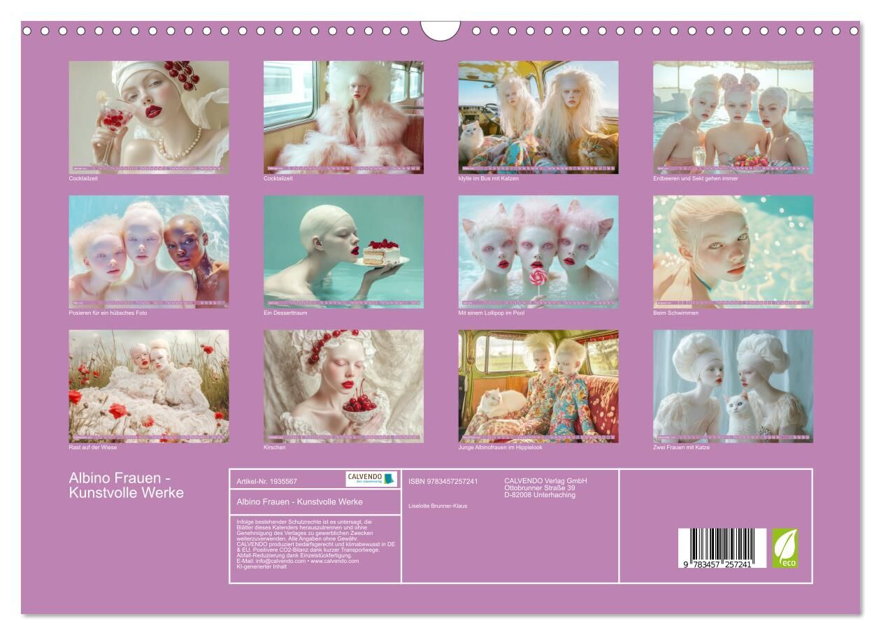 Entdecken Sie unseren einzigartigen Kalender, der die faszinierende Welt der KI-generierten Kunst feiert. Jede Seite zeigt elegante Albino Frauen, die modisch gekleidet sind und mit ihren roten Lippen einen Hauch von Eleganz versprühen. Lassen Sie sich von die...