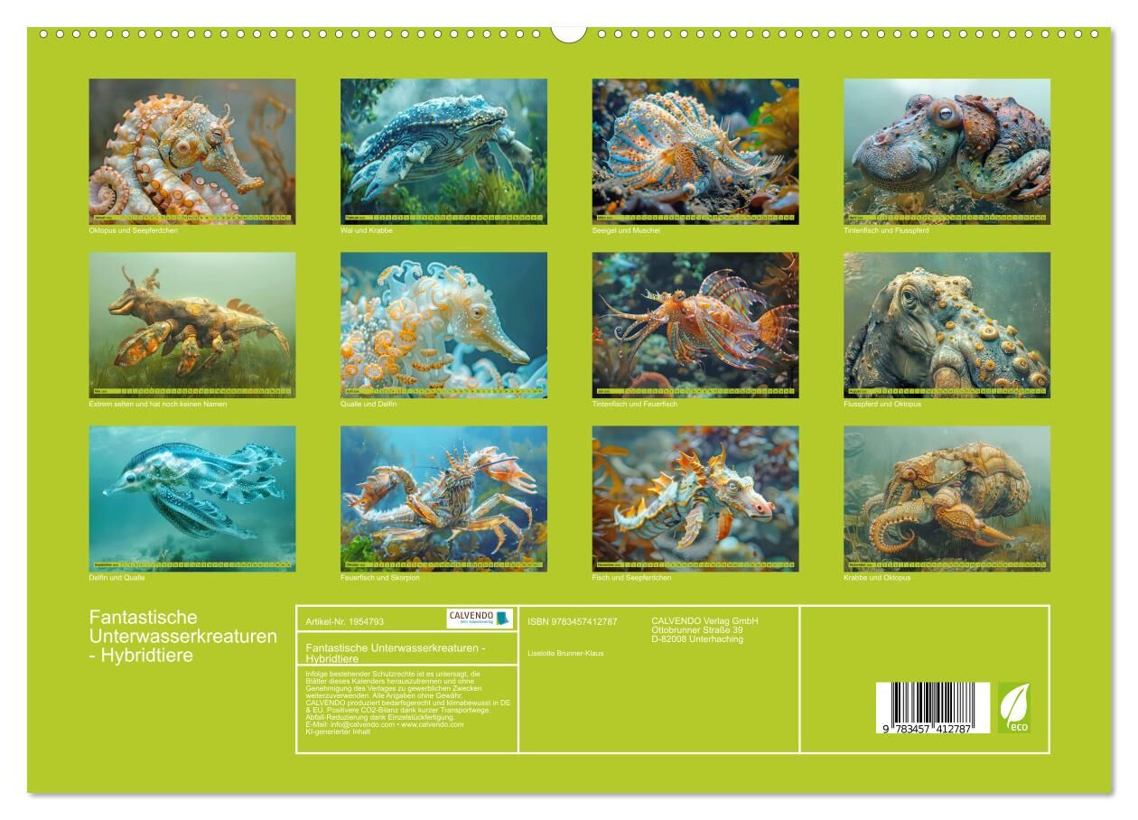Entdecken Sie eine faszinierende Welt von Unterwasserhybridtieren. Dieser einzigartige Kalender präsentiert Ihnen eine fantastische Sammlung von Unterwasserkreaturen, die mittels KI aus unterschiedlichen existierenden Tieren kombiniert wurden. Von Oktopus und ...